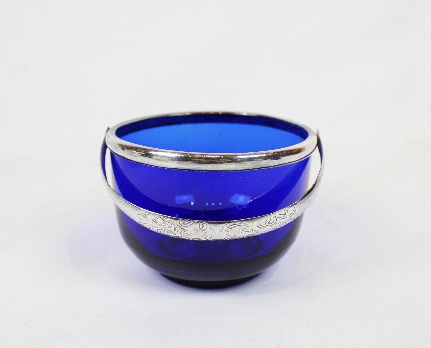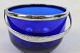 Sugar bowl decorated with silver handle and cream jug both of dark blue glass by Holmegaard in the 1930s.