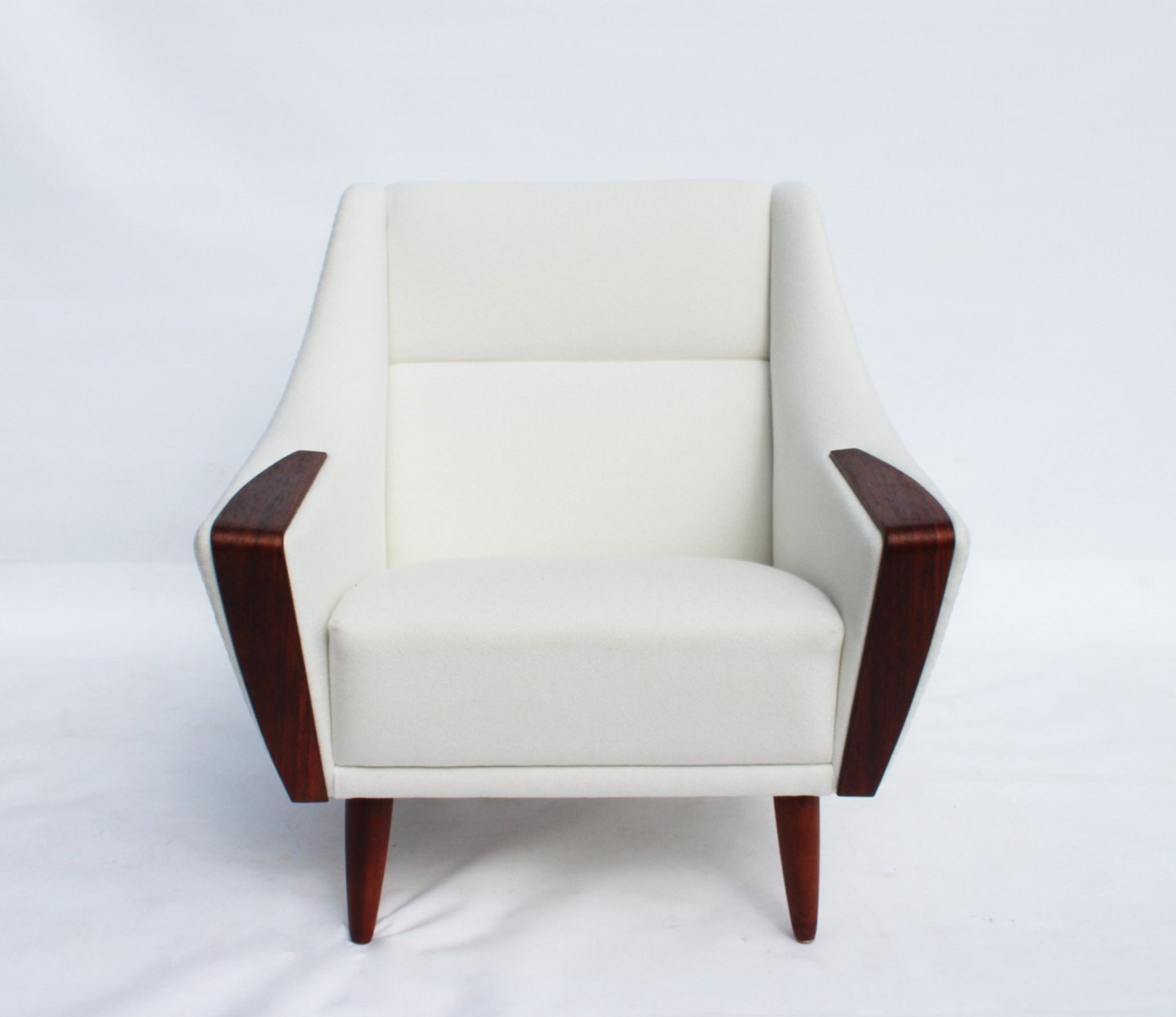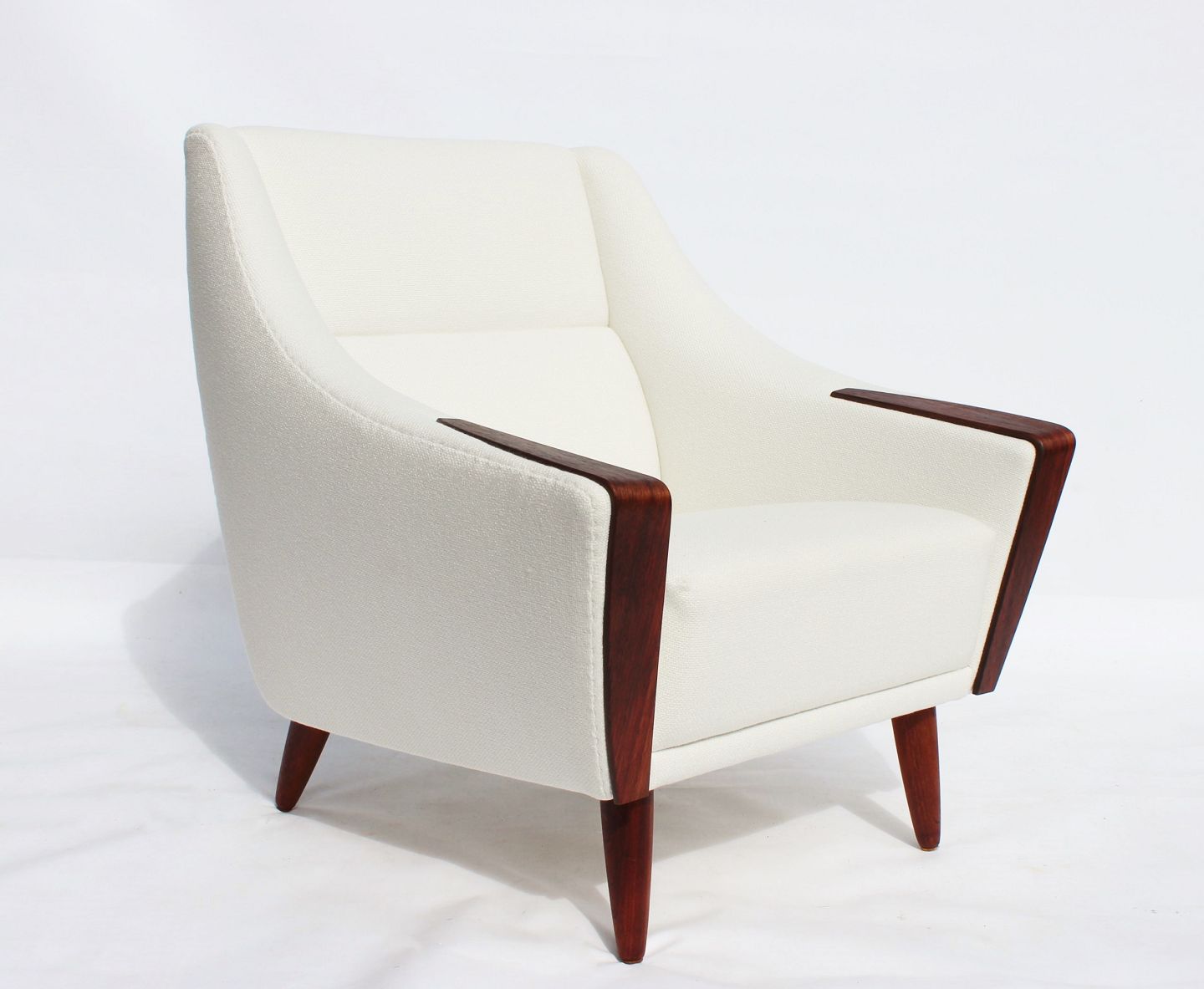Please contact us for price informationThe armchair with a low back, upholstered in an elegant white fabric and resting on beautifully polished rosewood legs, is a masterpiece of Danish design from the 1960s. Its clean lines and organic form reflect the period aesthetics of Scandinavian furniture design.