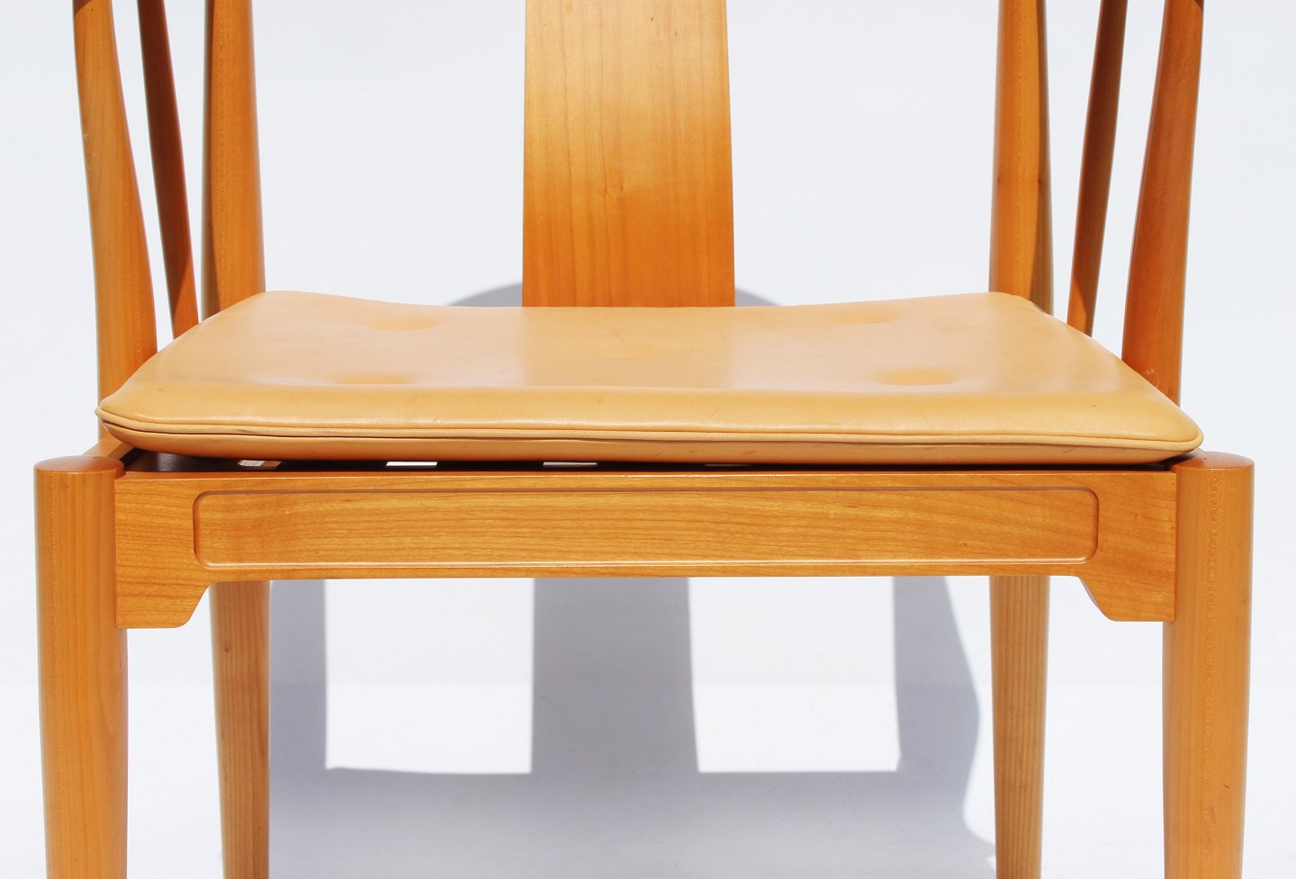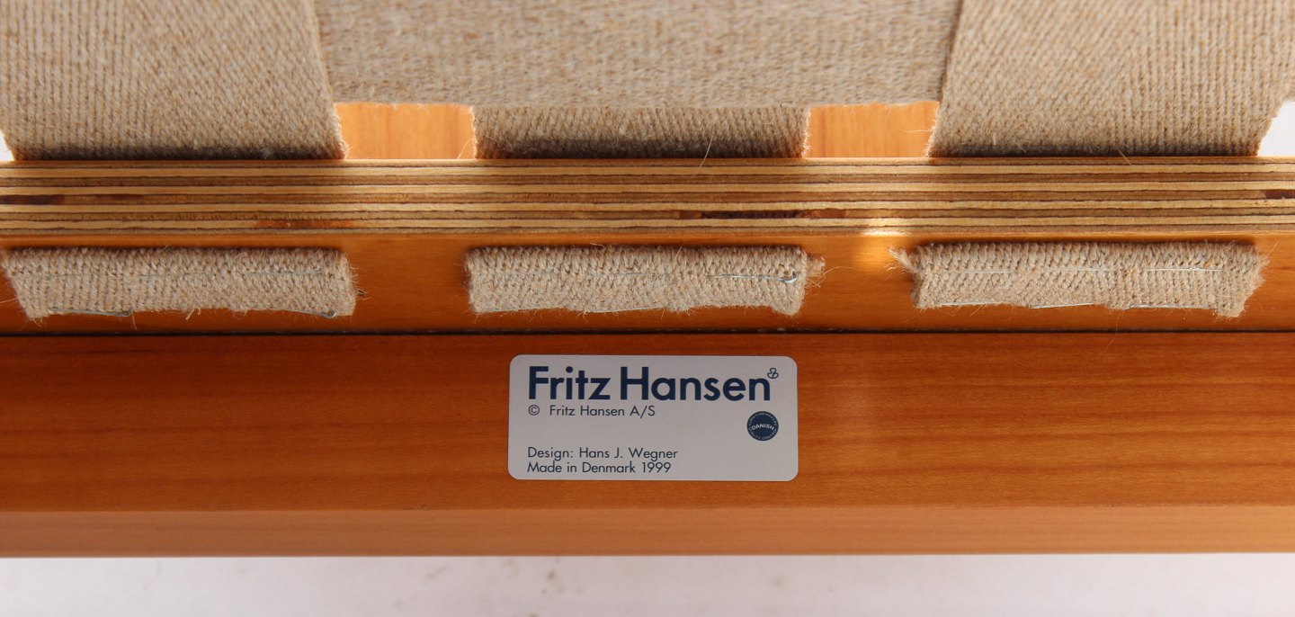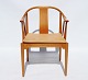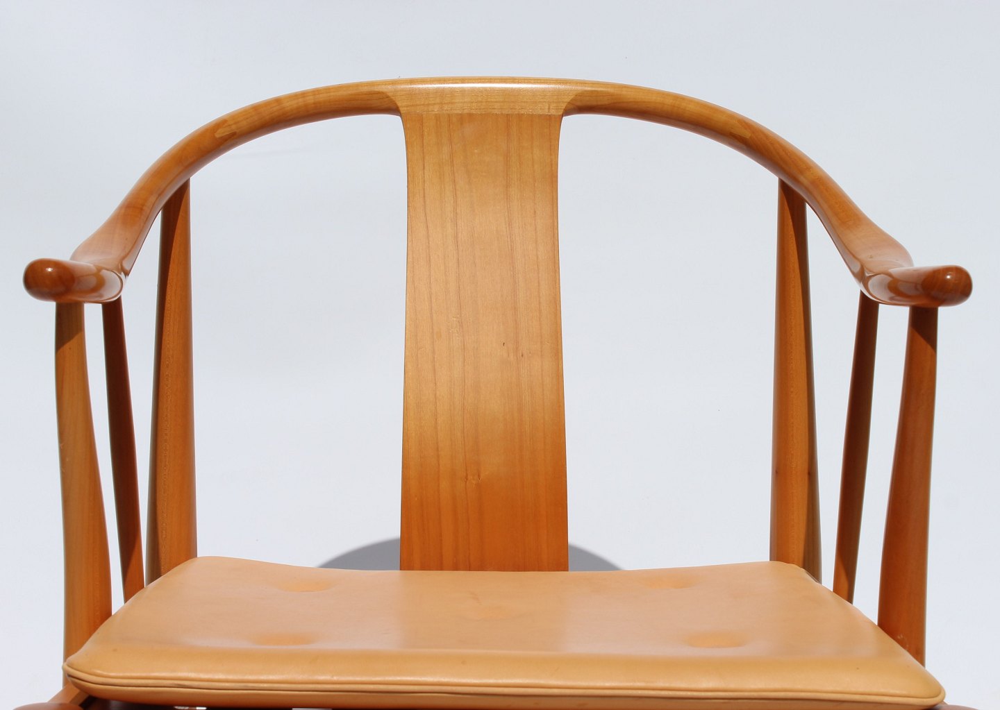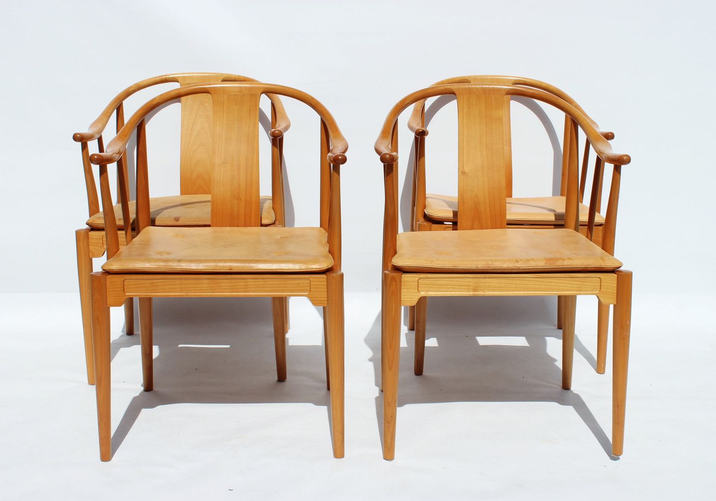 SoldA set of four China chairs, model 4283, designed by Hans J. Wegner in 1944 and manufactured by Fritz Hansen in 1999. The chairs are of cherry and with cushion of patinated leather. 2 chairs left.