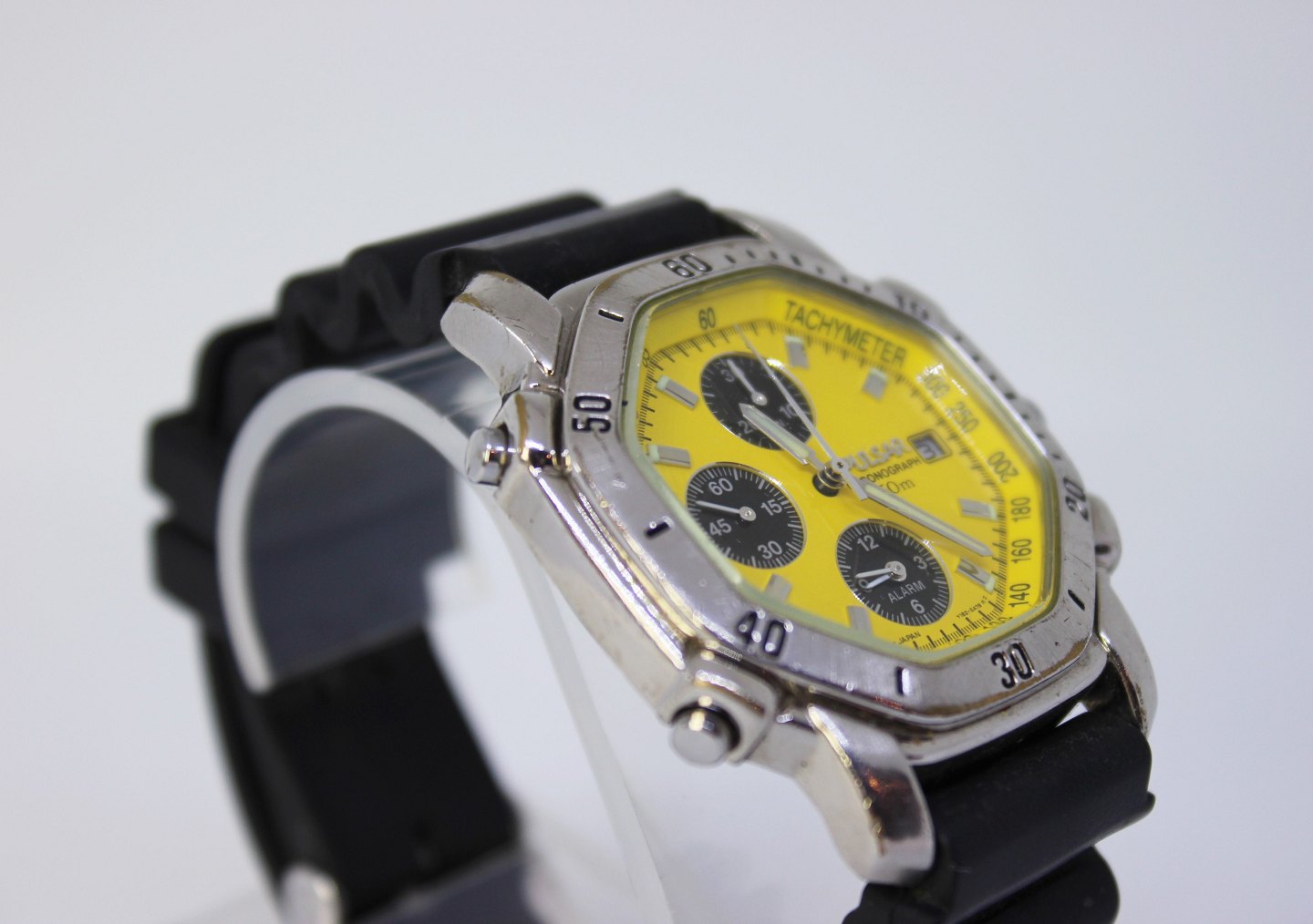 Pulsar quartz men's watch with chronograph, alarm and strap of black rubber. The watch is of stainless steel water resistant 5BAR.