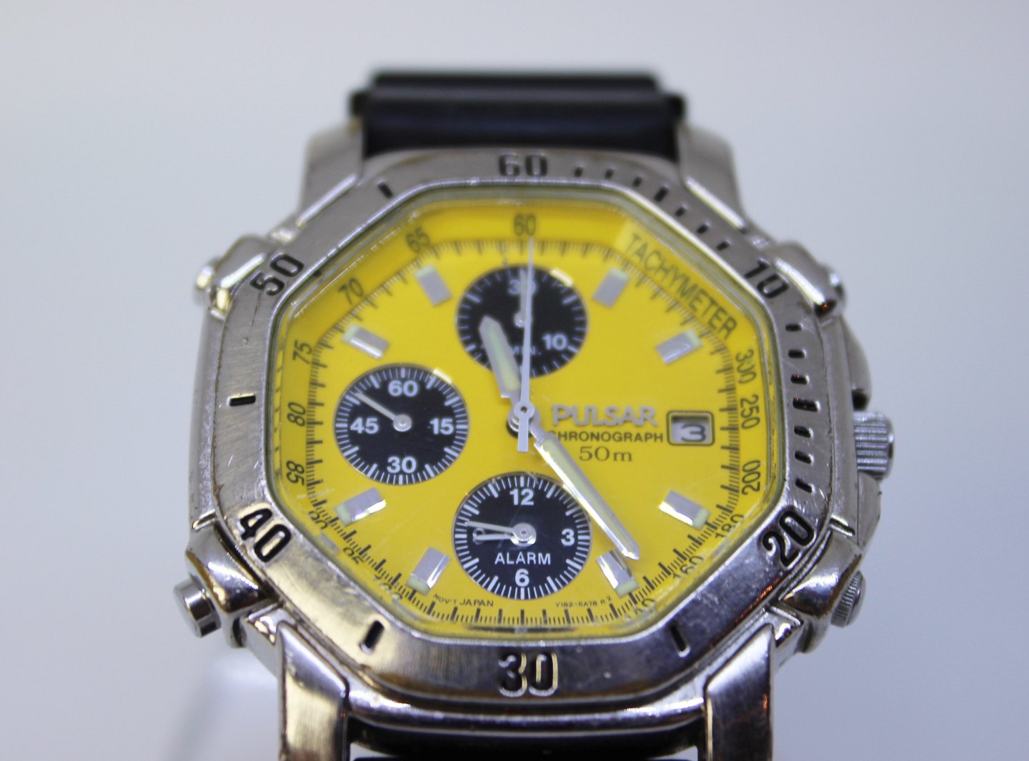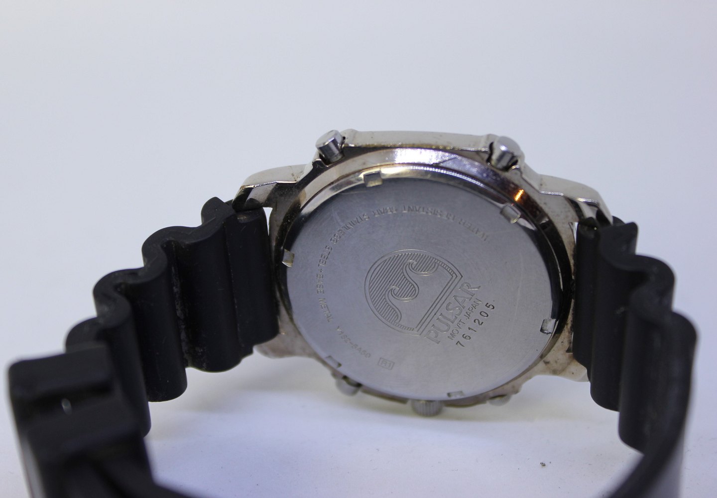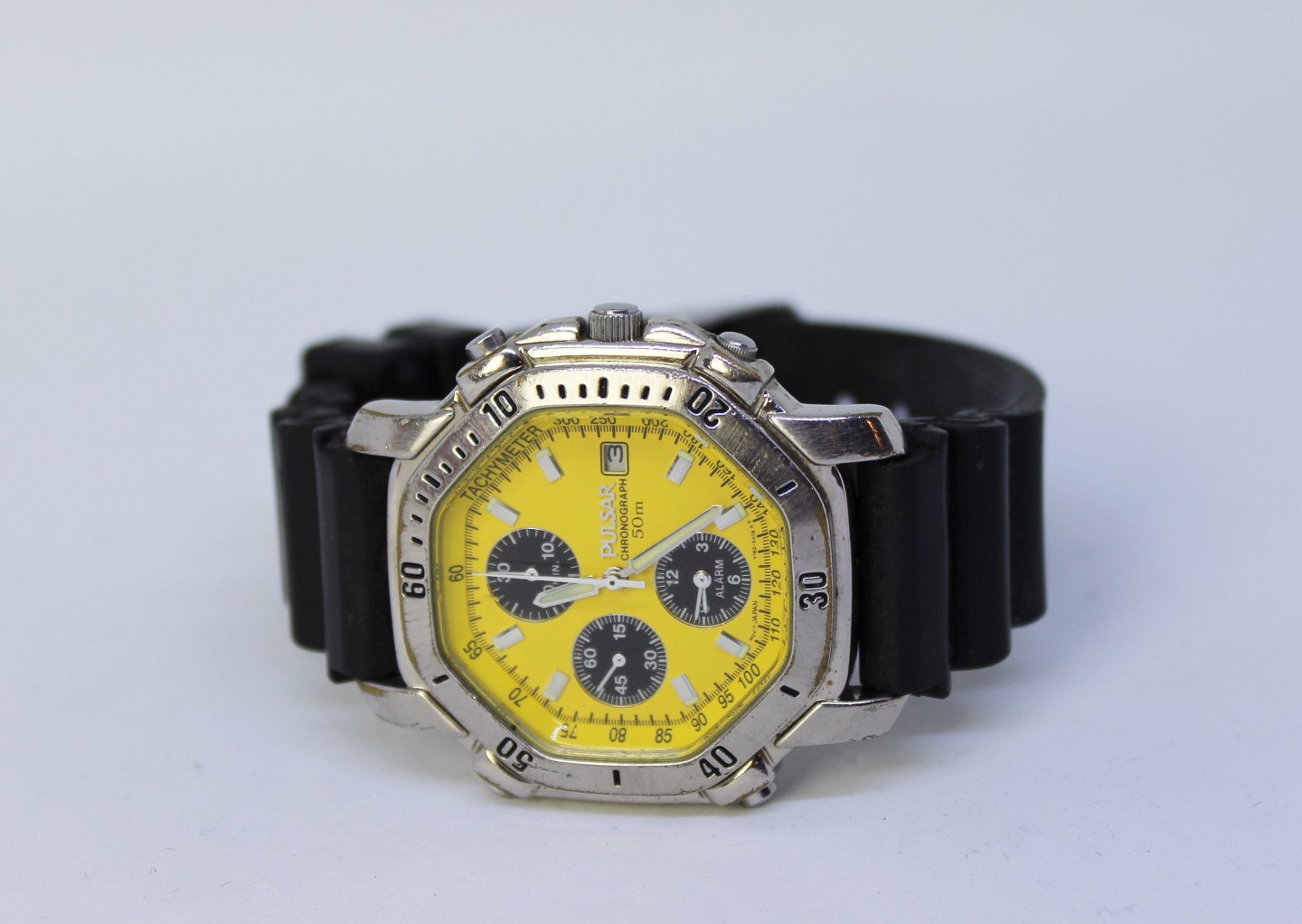 Pulsar quartz men's watch with chronograph, alarm and strap of black rubber.
