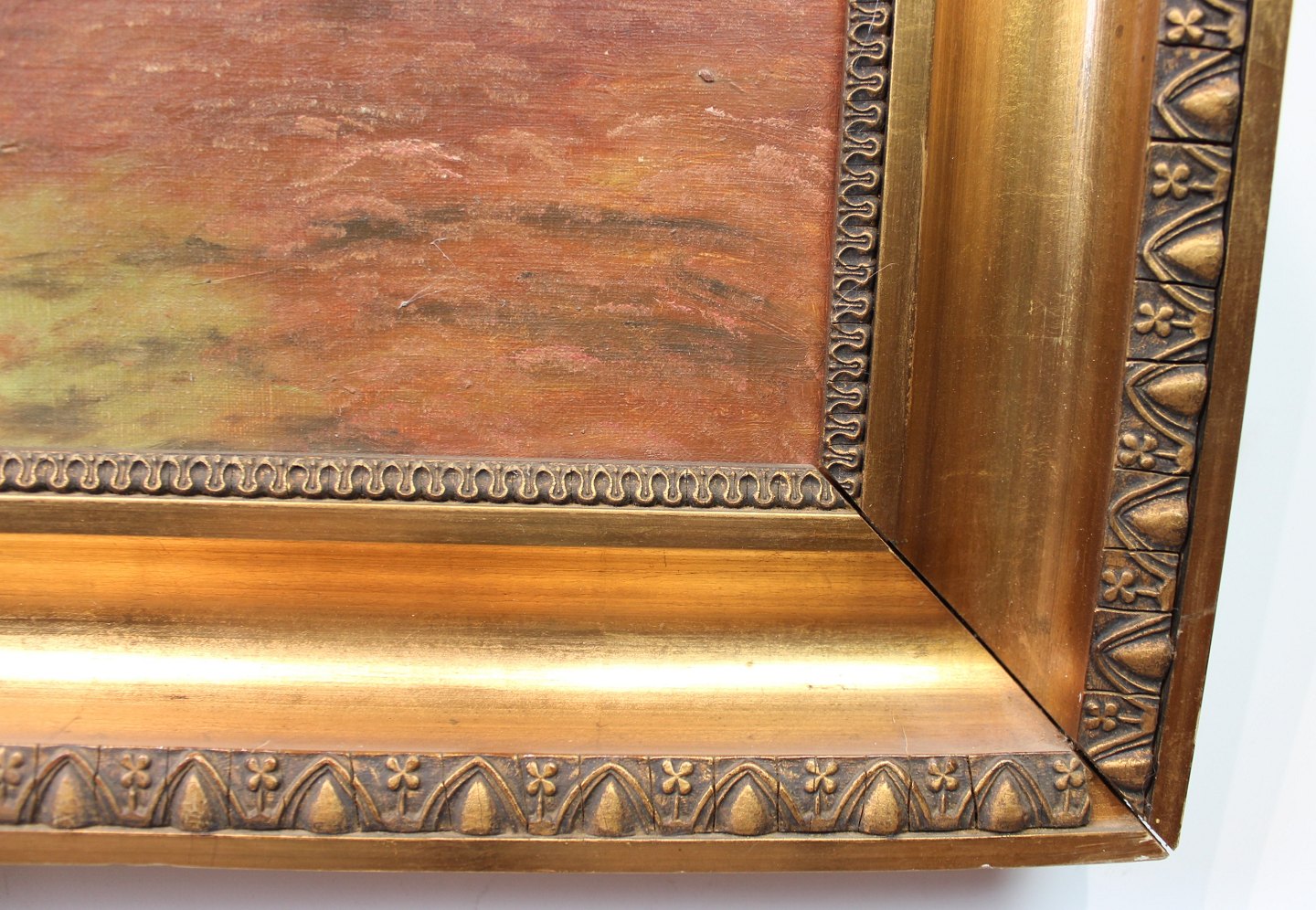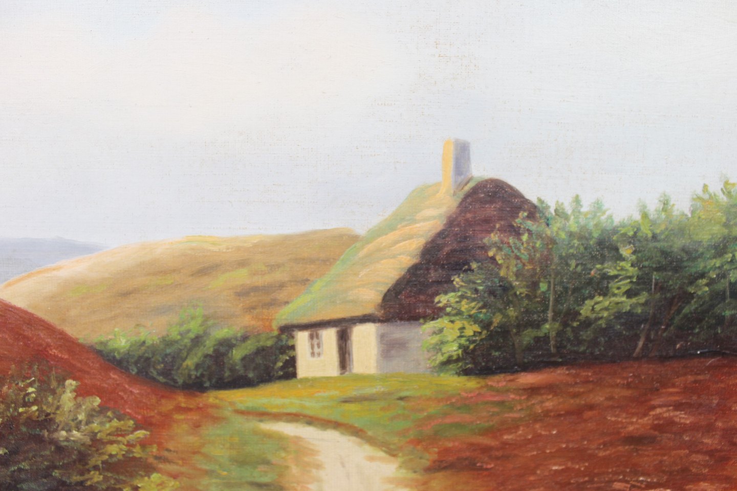 Oliemaleri i varme farver med motiv af marker og stråtækt hus med forgyldt ramme.