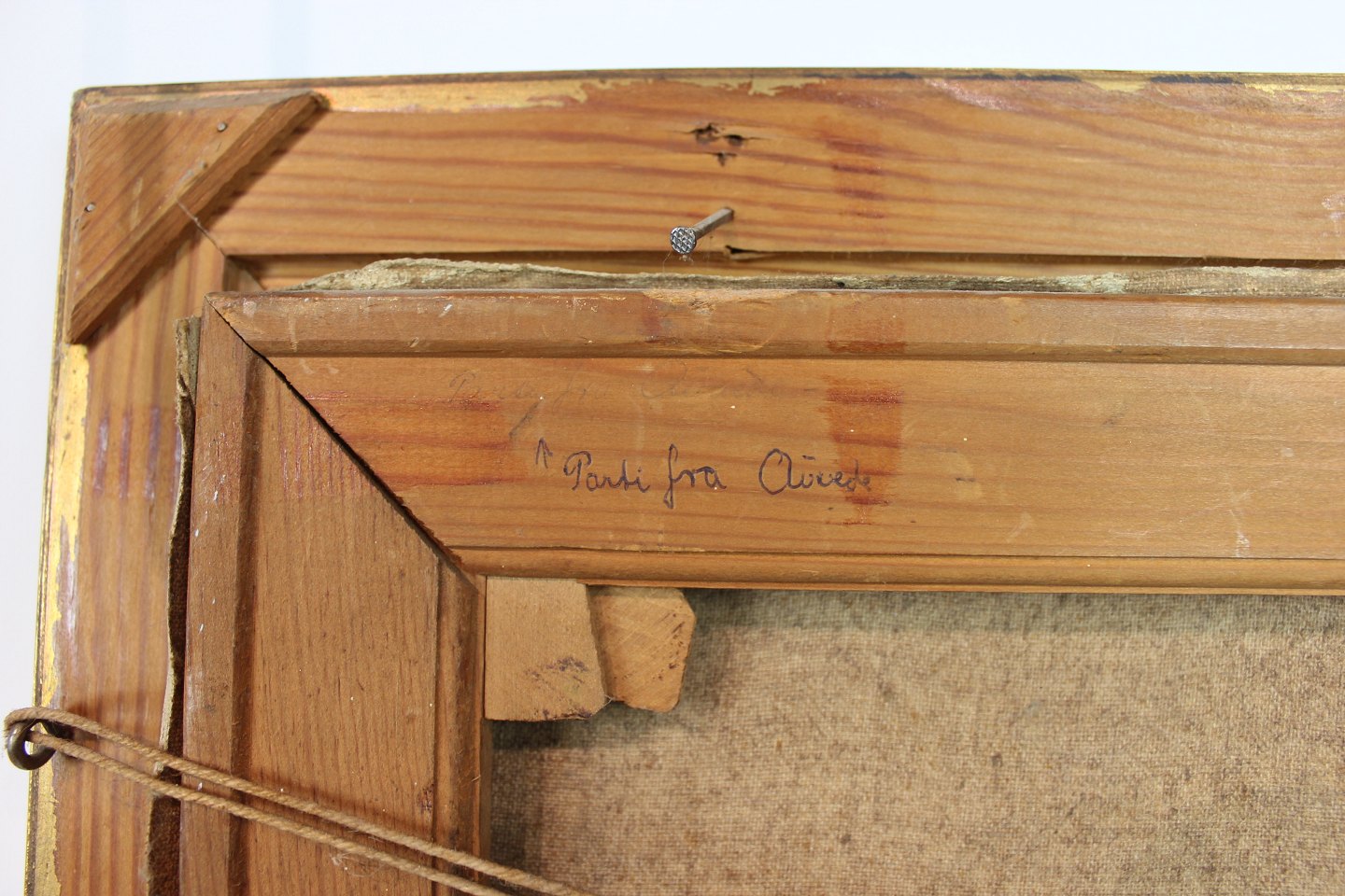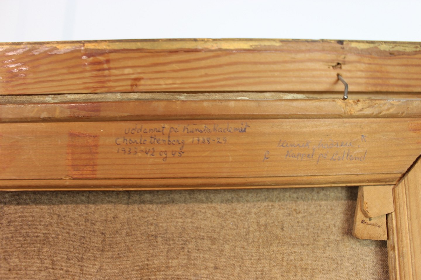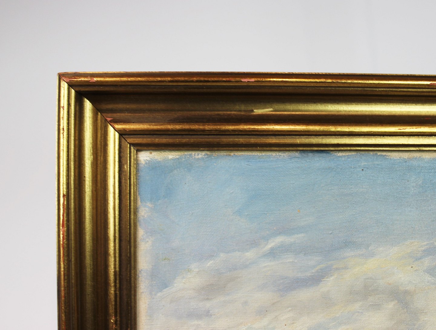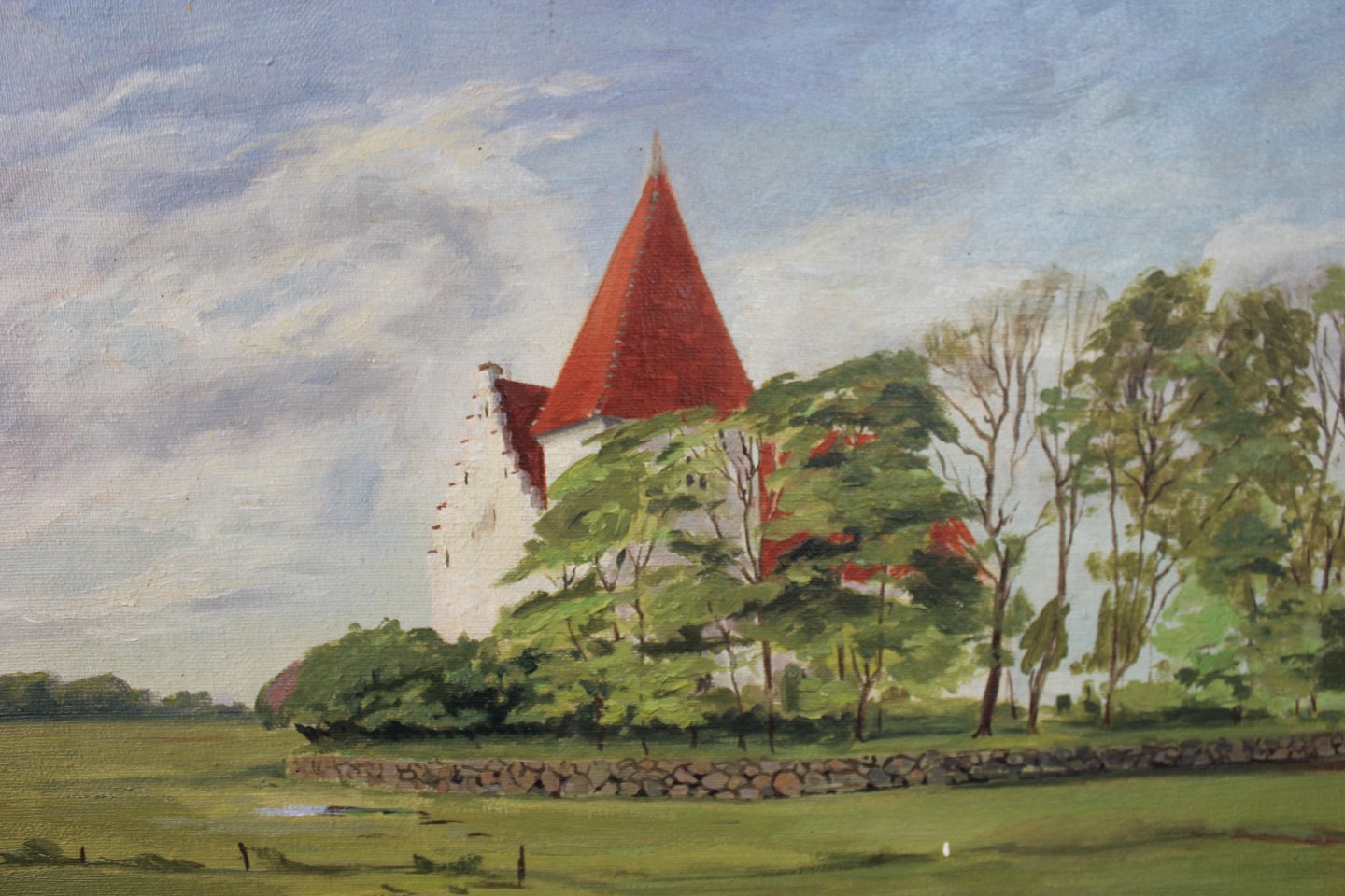 Oliemaleri med motiv af kirke signeret af H. Madsen i 1923.
