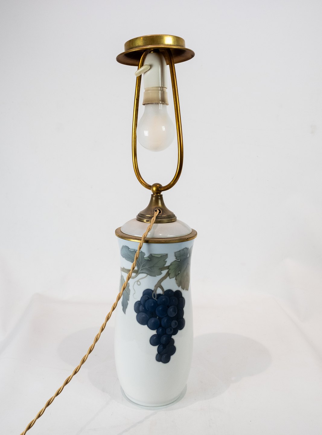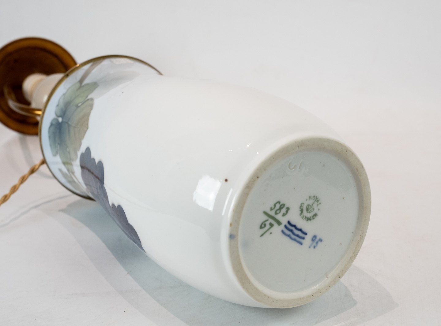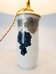Porcelænsbordlampe af Royal Copenhagen med dekorationsnummer 583/67. Skærmen er håndmalet og håndfoldet i papir.