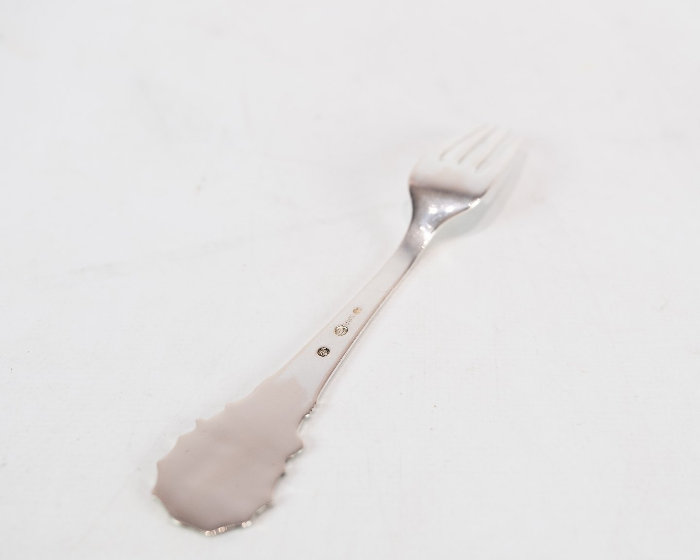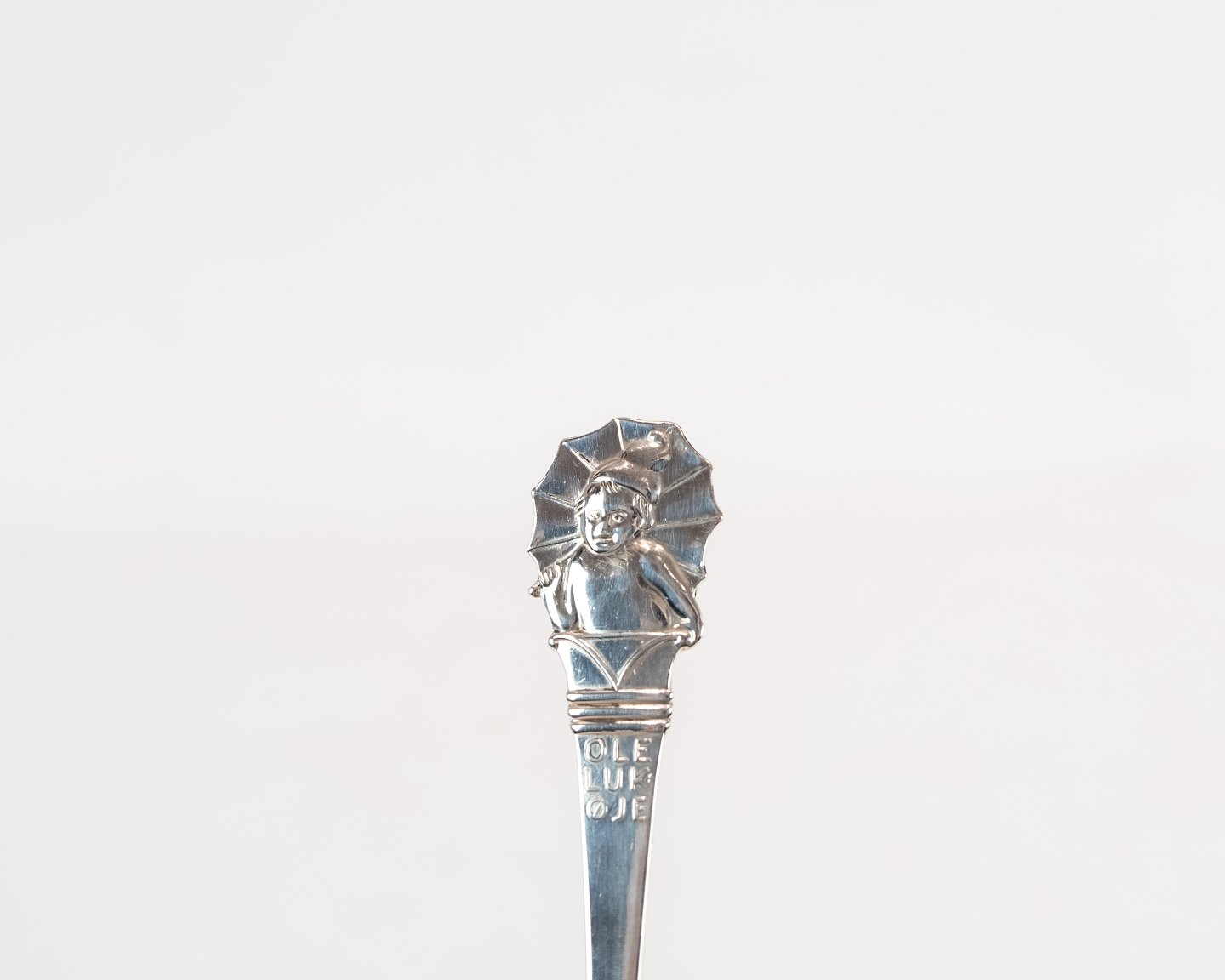 Barnegaffel med motif af H.C. Andersen Ole Lukøje i tretårnet sølv.