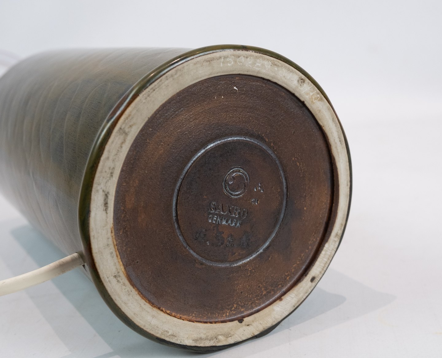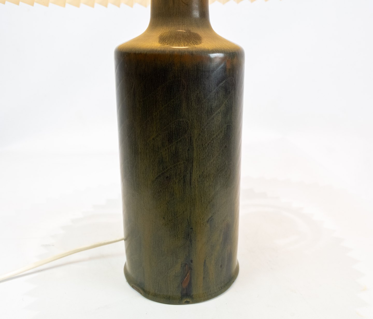 Keramik bordlampe i mørkegrøn farve af Eva Stær Nielsen for Saxbo. Skærmen er hånd foldet og håndmalet i papir.