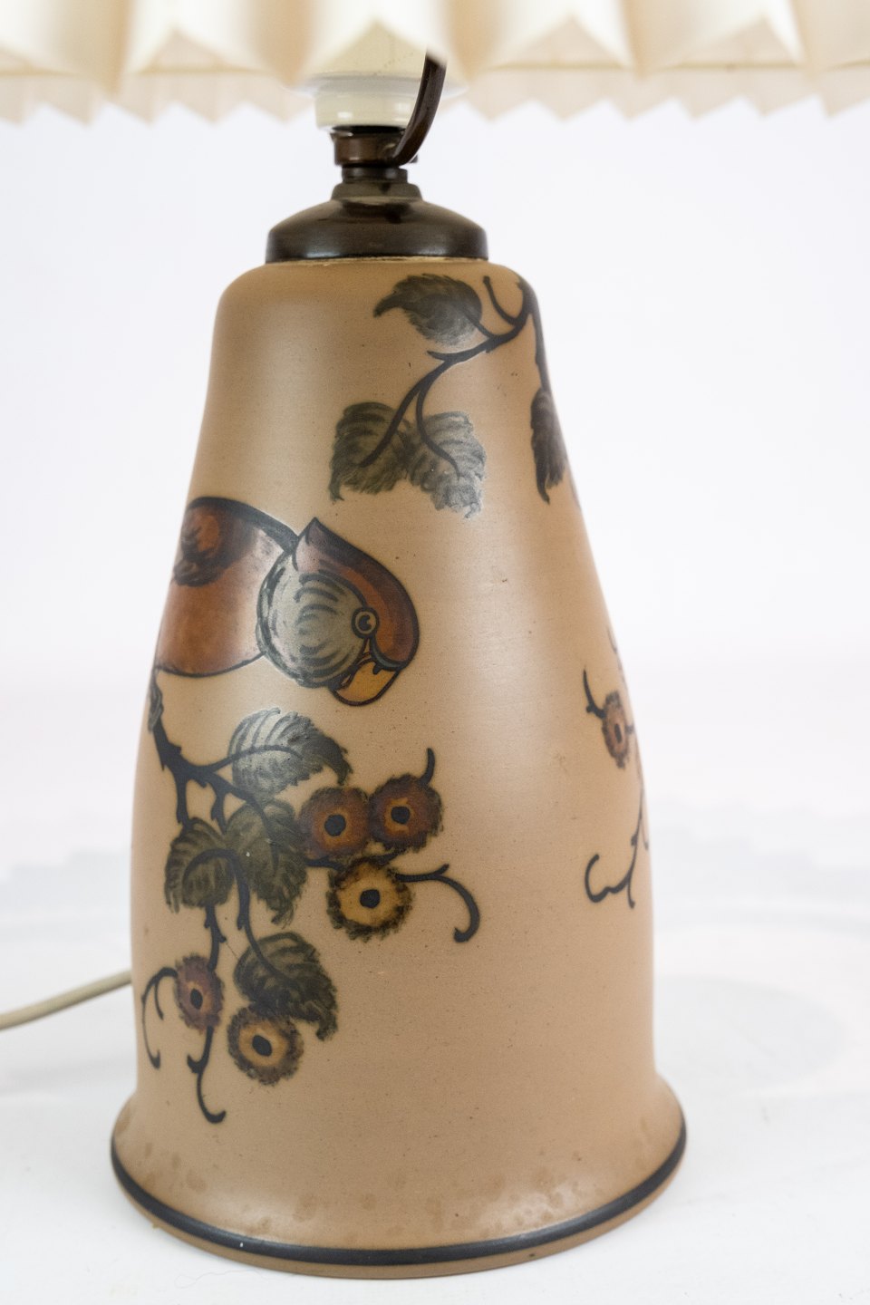 Bordlampe i brune farver, model MAG9, af Hjort Denmark. Skærmen er håndfoldet og håndmalet i papir.
