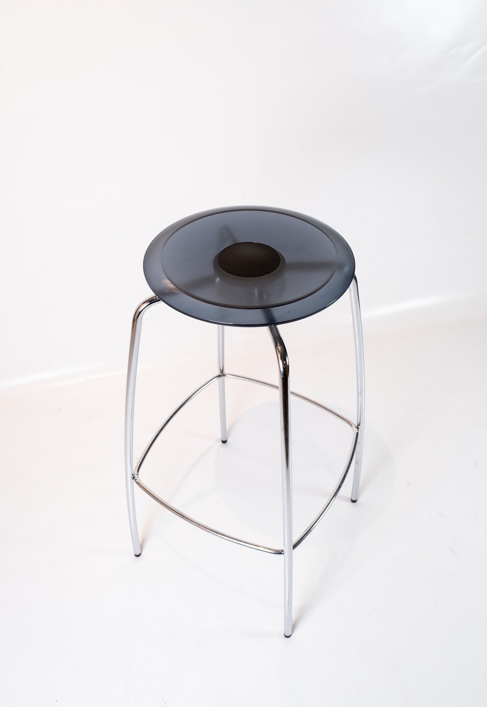 Bar stool with seat in black plastic and metal frame. A minimalist yet elegant piece of furniture, perfect for any modern interior.