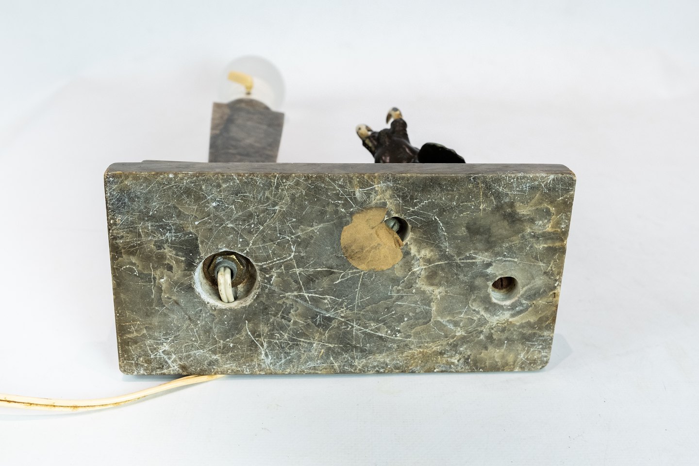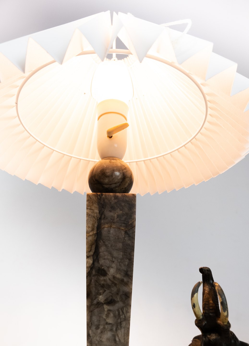 Table lamp made of marble with decorativ elephant. The shade is handpainted and handfolded of paper.