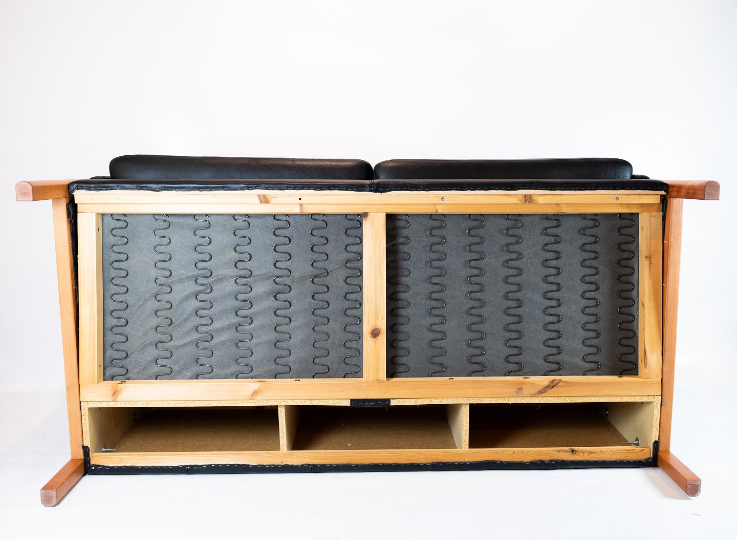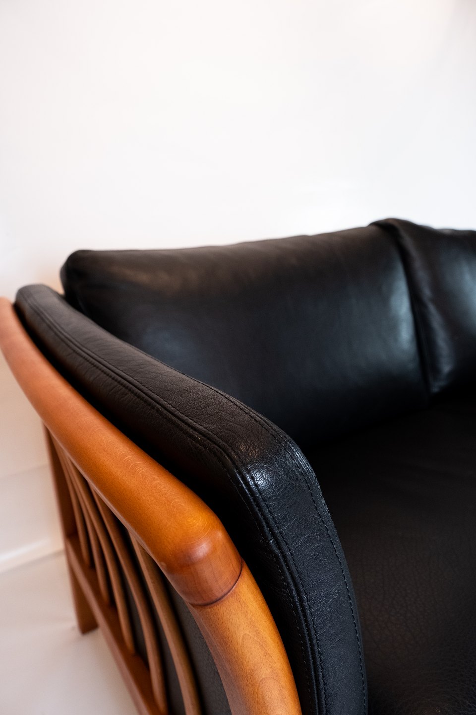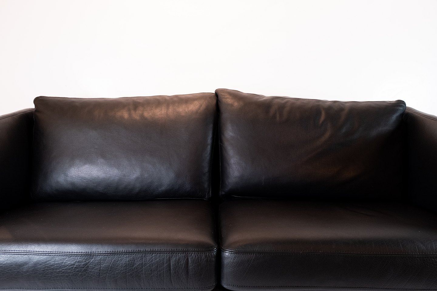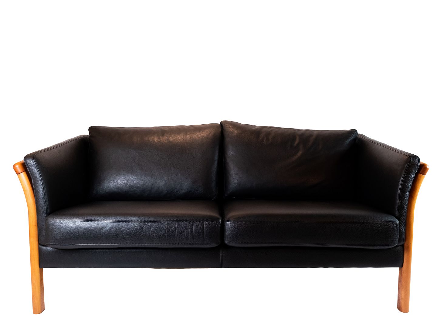 To personers tremmesofa polstret med sort læder af dansk design.
