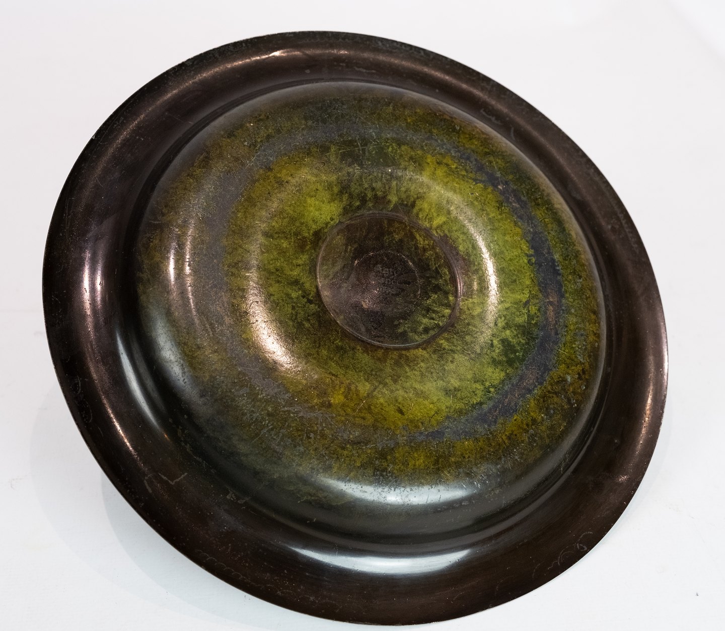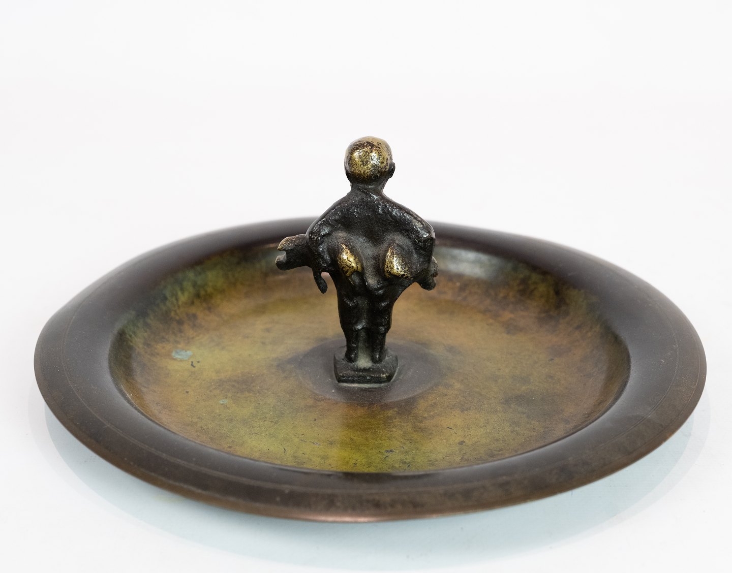 Rundt fad af bronze dekoreret med drengefigur. Fadet er i flot brugt stand.