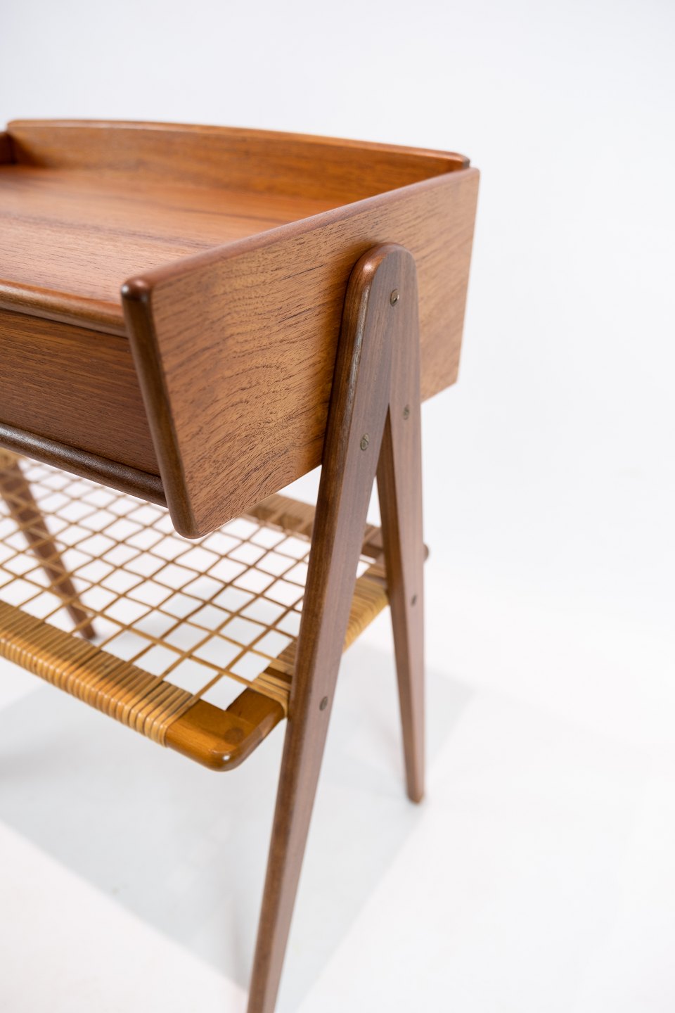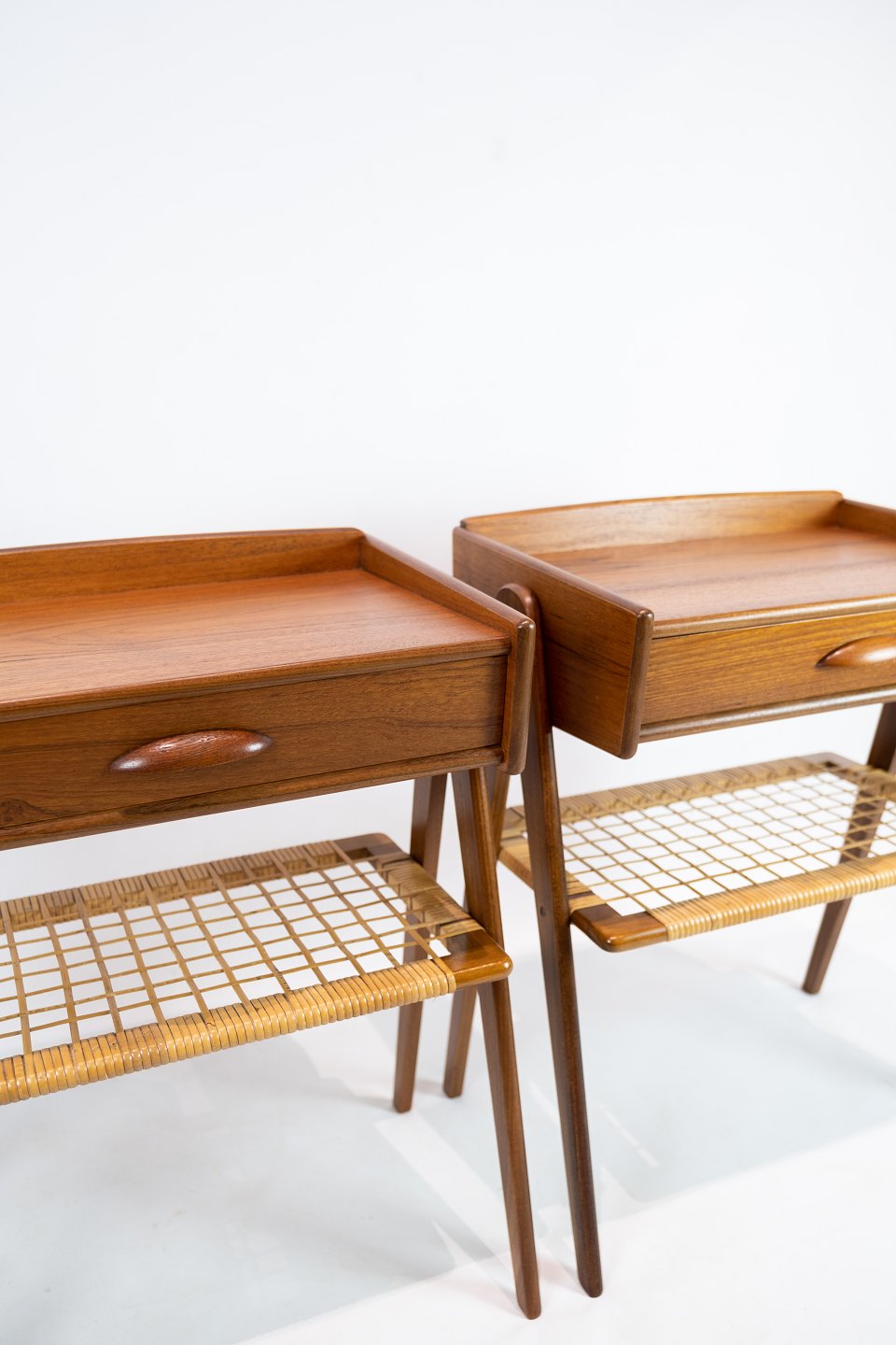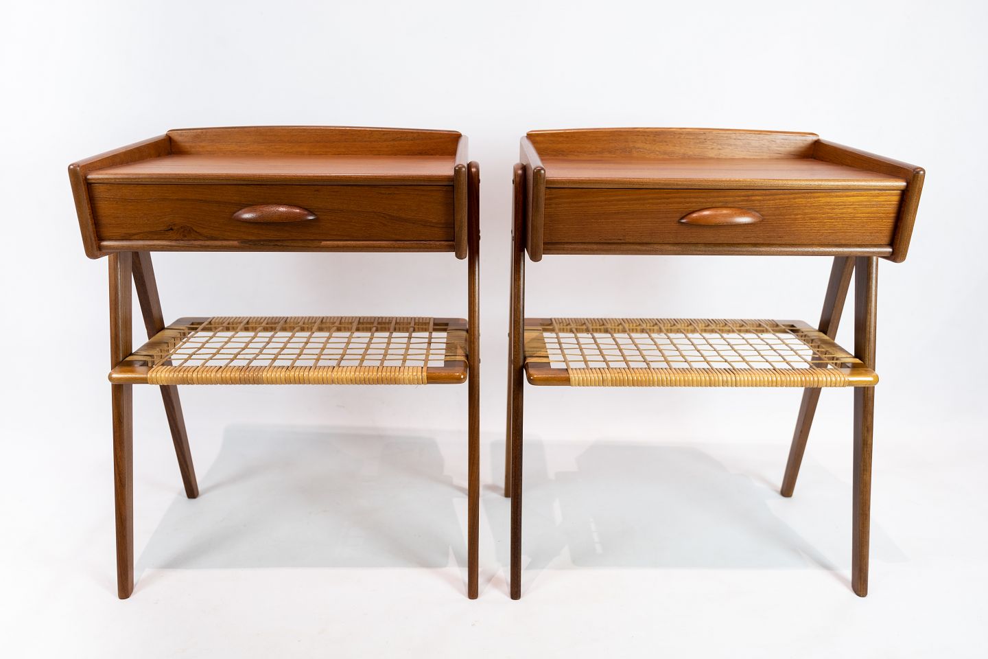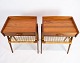 A pair of side tables in teak with paper cord shelf of danish design from the 1960s.