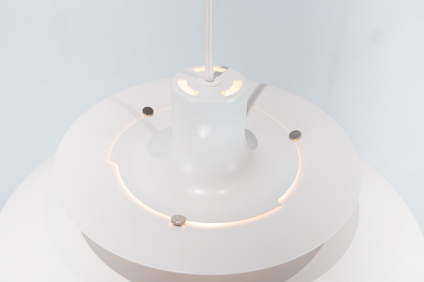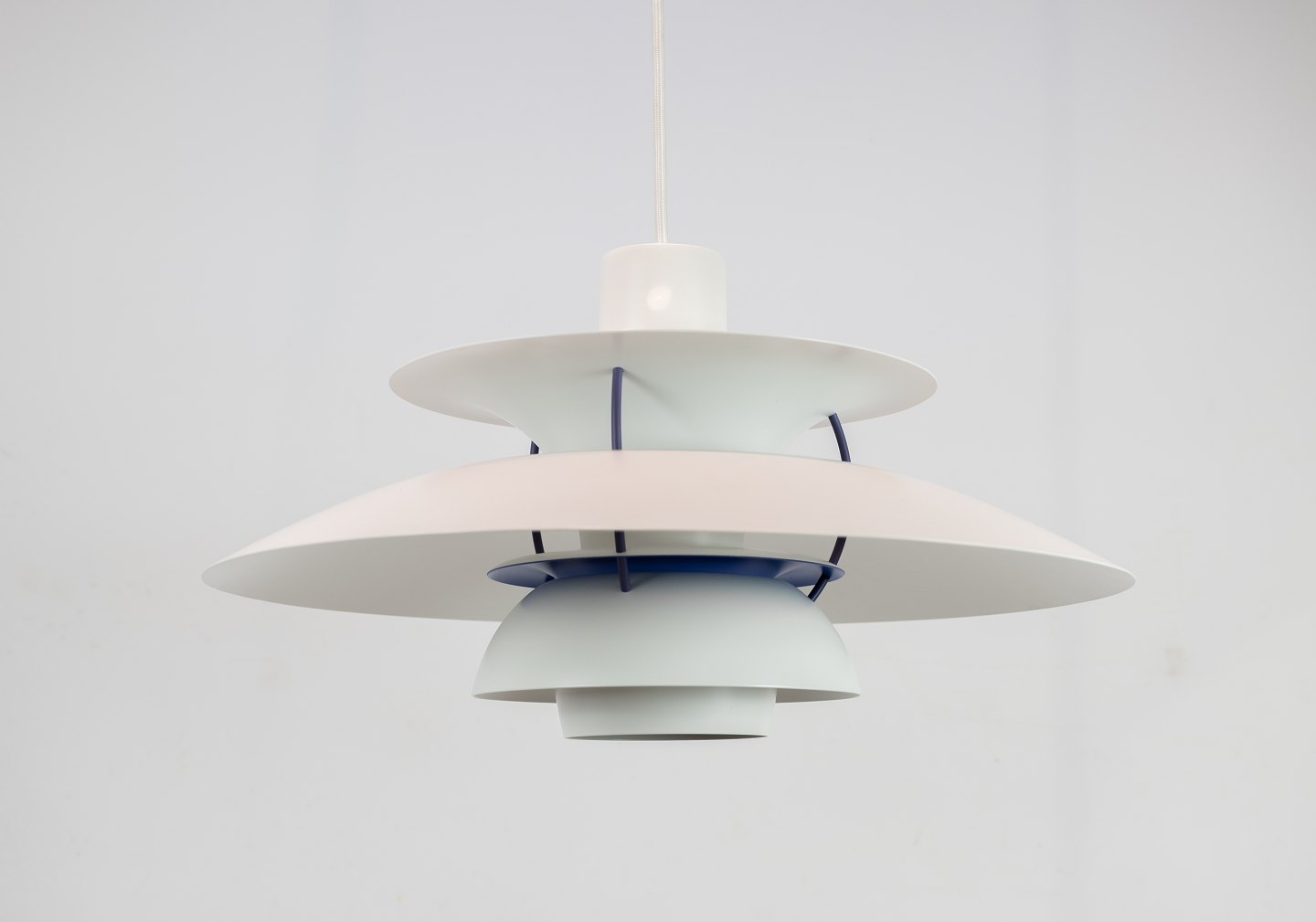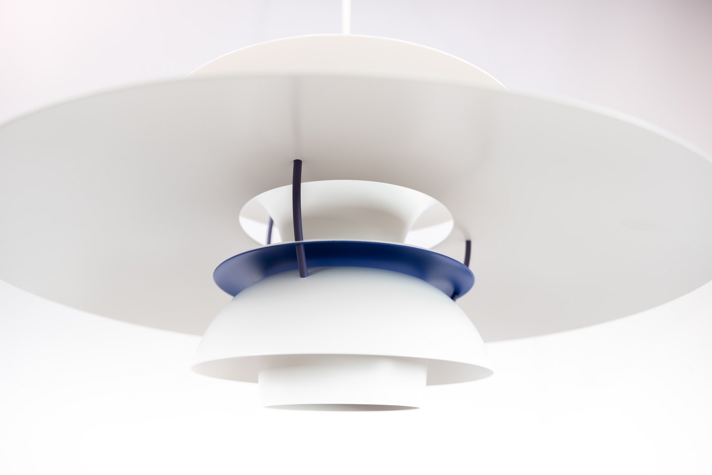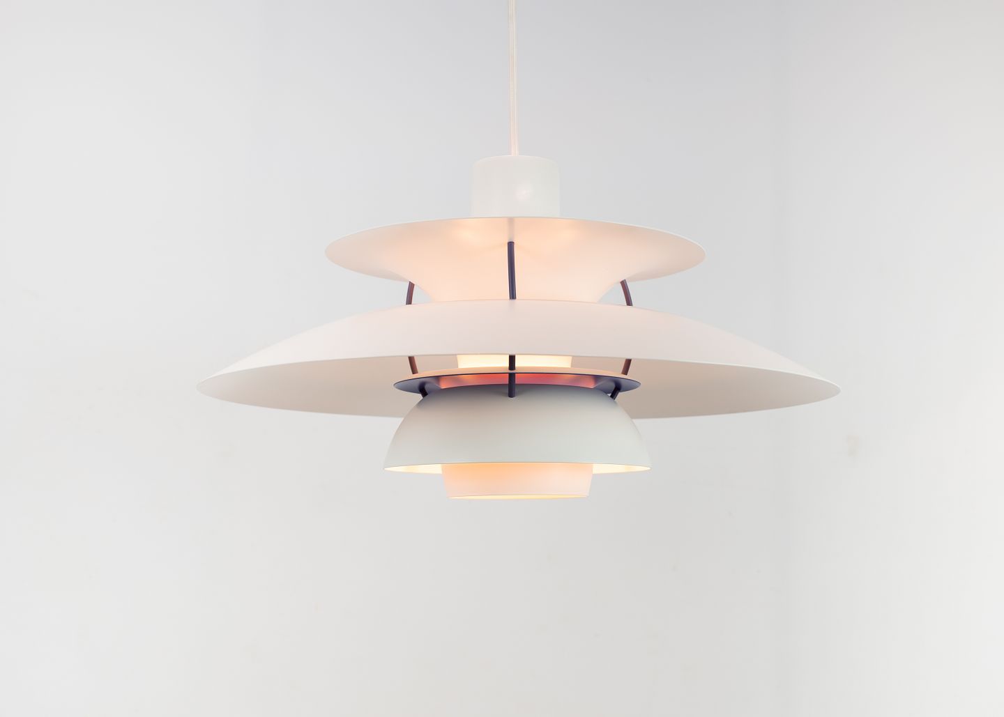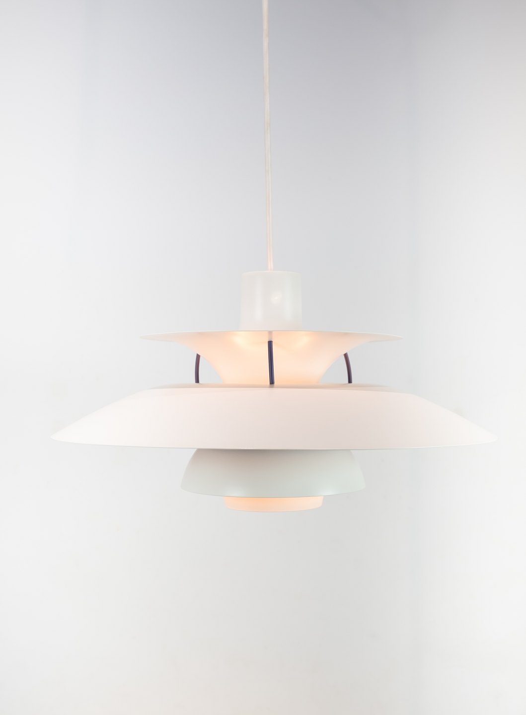 PH5 lamp designed by Poul Henningsen in 1958 and manufactured by Louis Poulsen. The lamp has lacquered metal shades in white and a newer model.