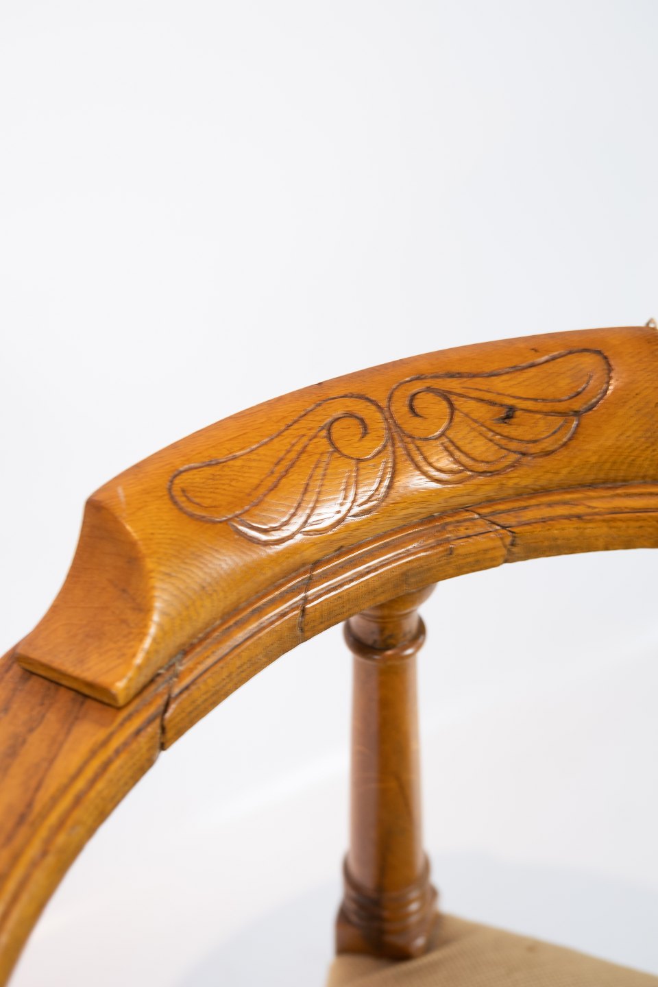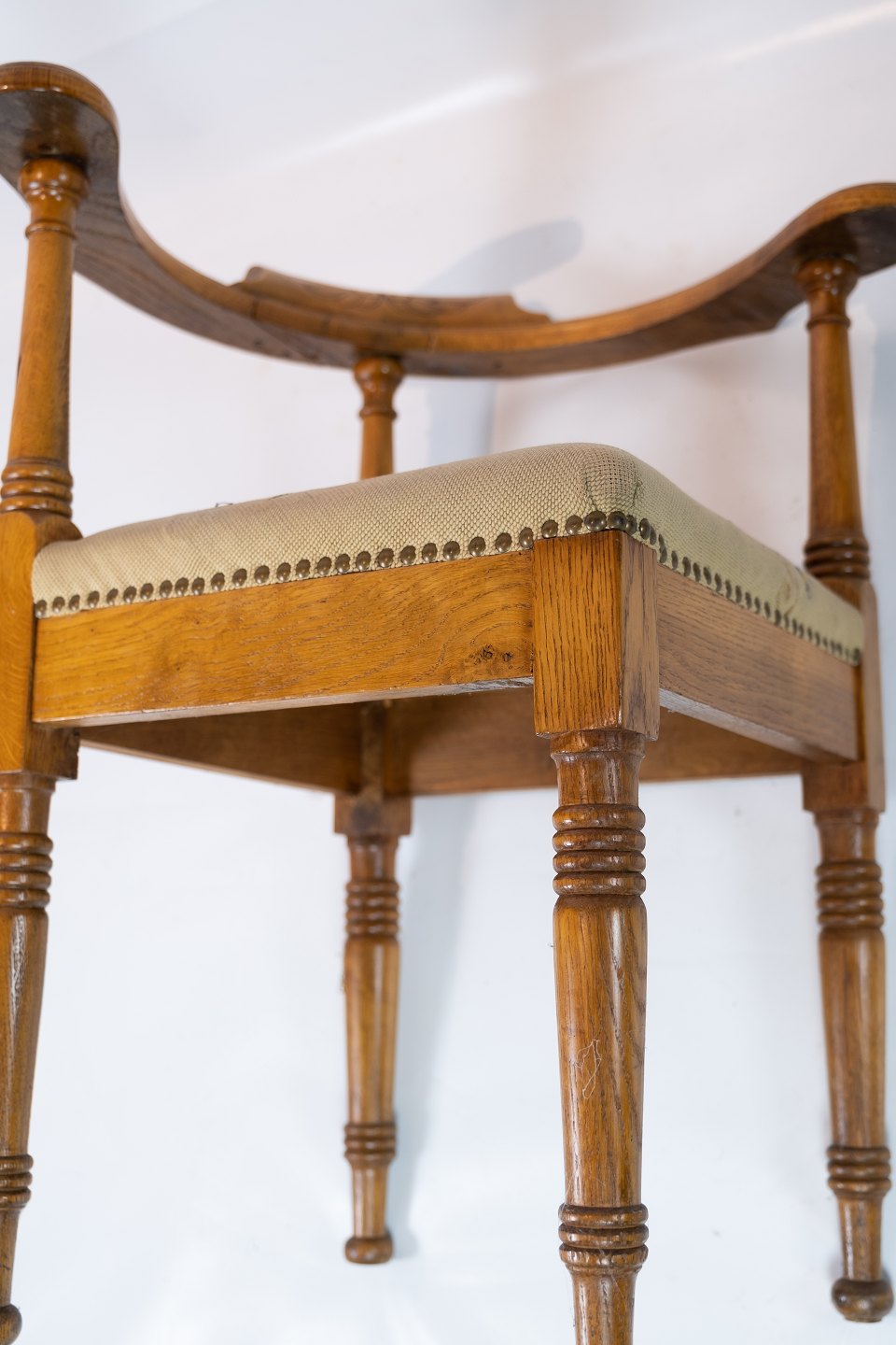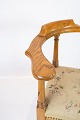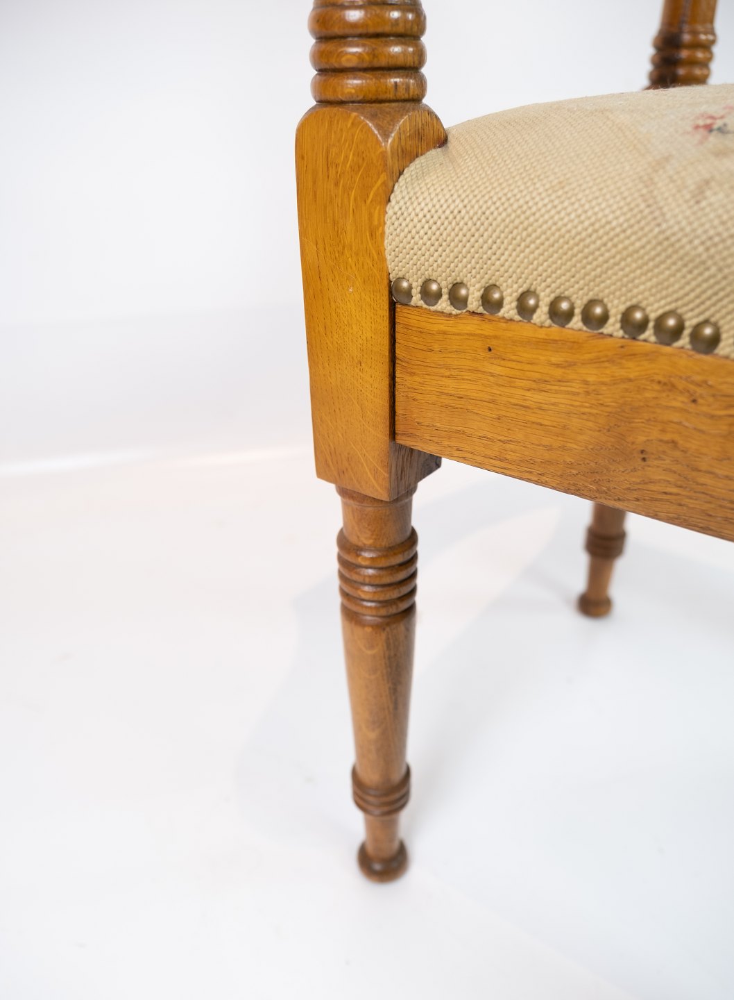 Armchair in polished oak and upholstered with light embroided fabric from the 1910s. The chair is in great antique condition.