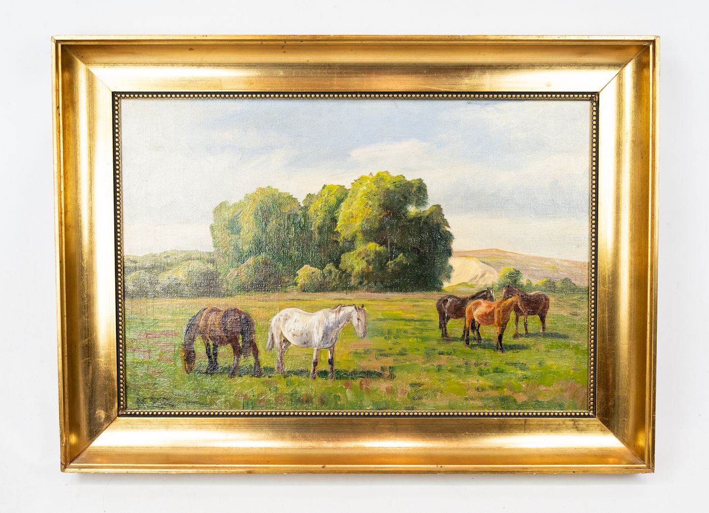 SoldOil painting with horse motif and gilded frame by Niels Christiansen (1873-1960).