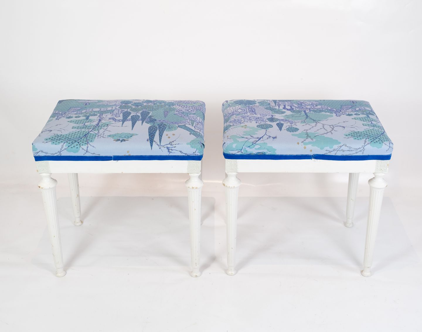 A pair of antique stools of white painted wood and upholstered with blue fabric from the 1920s.
