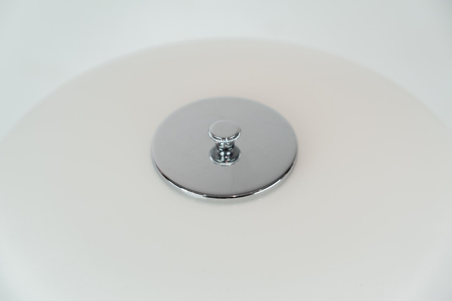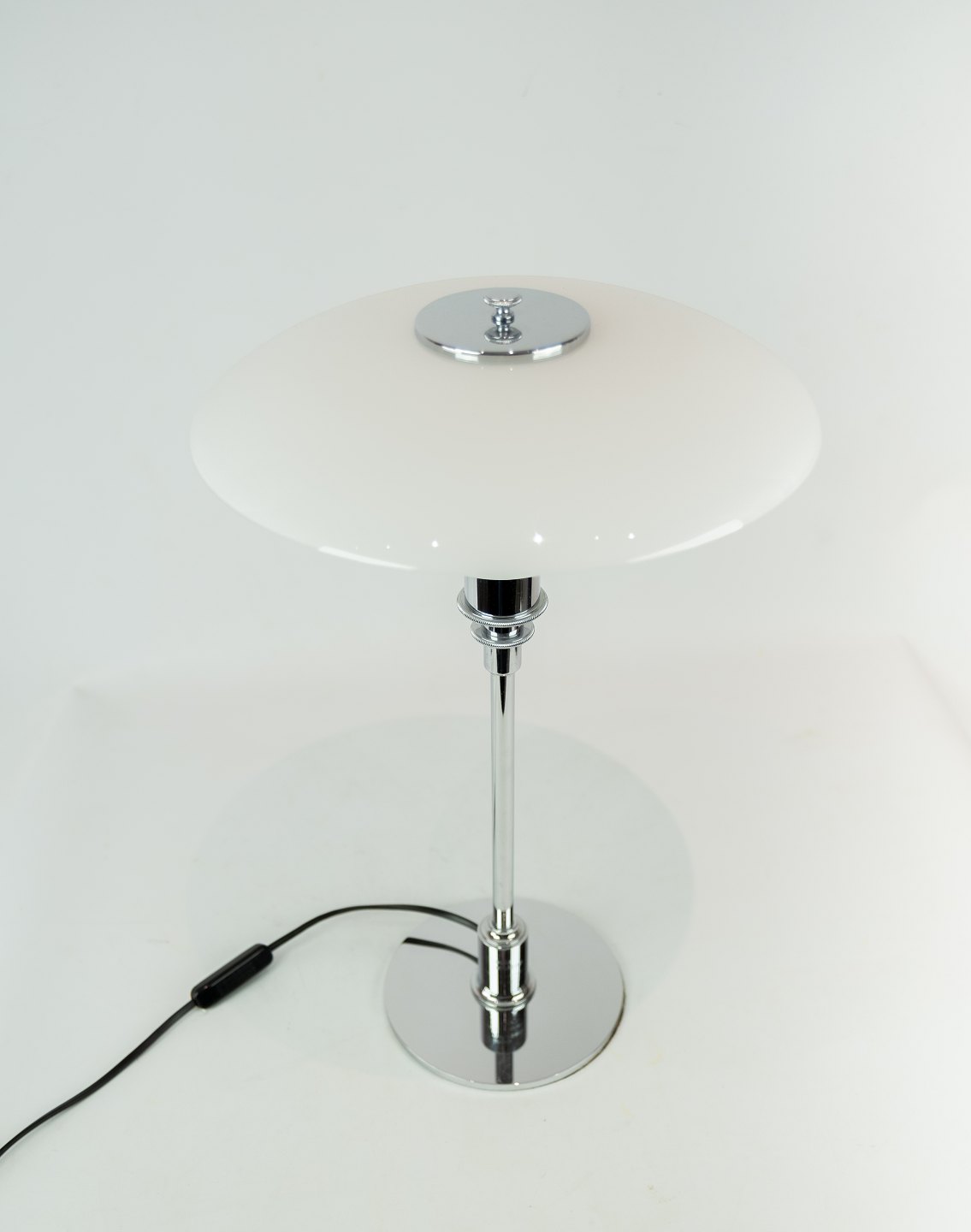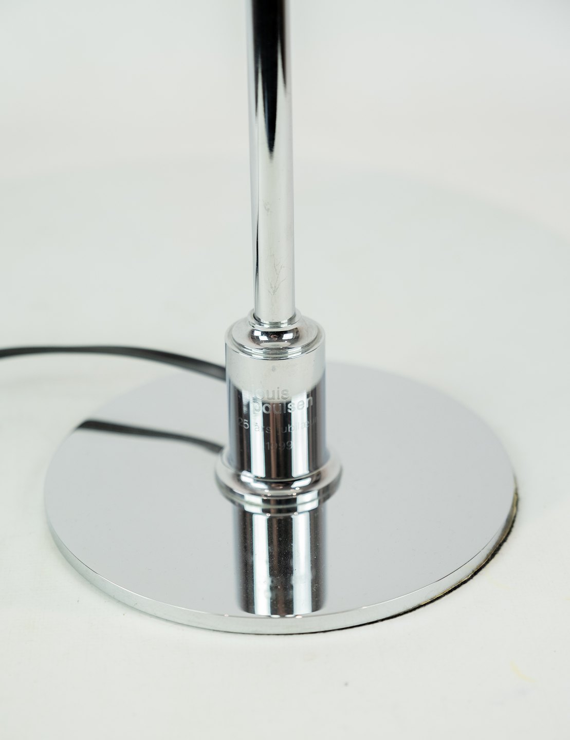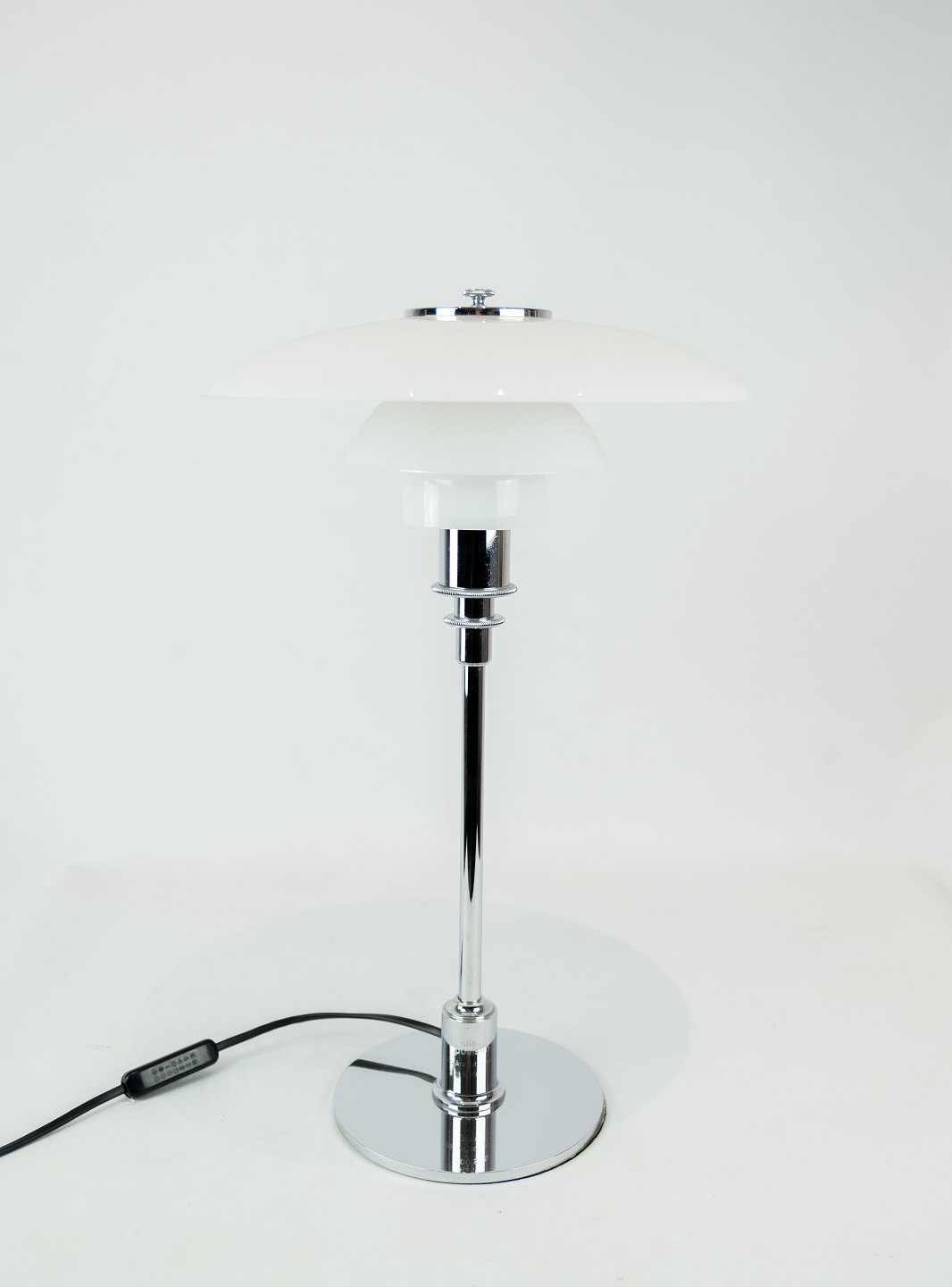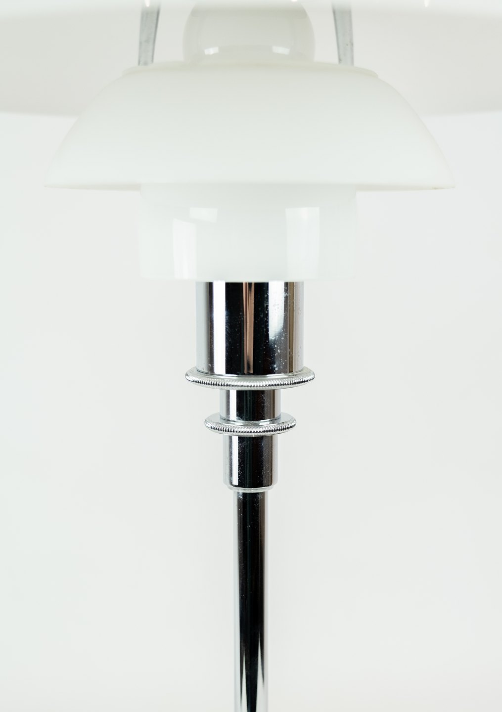 PH 3/2 table lamp with chrome stem and white opaline glass shades, designed by Poul Henningsen and manufactured by Louis Poulsen.
