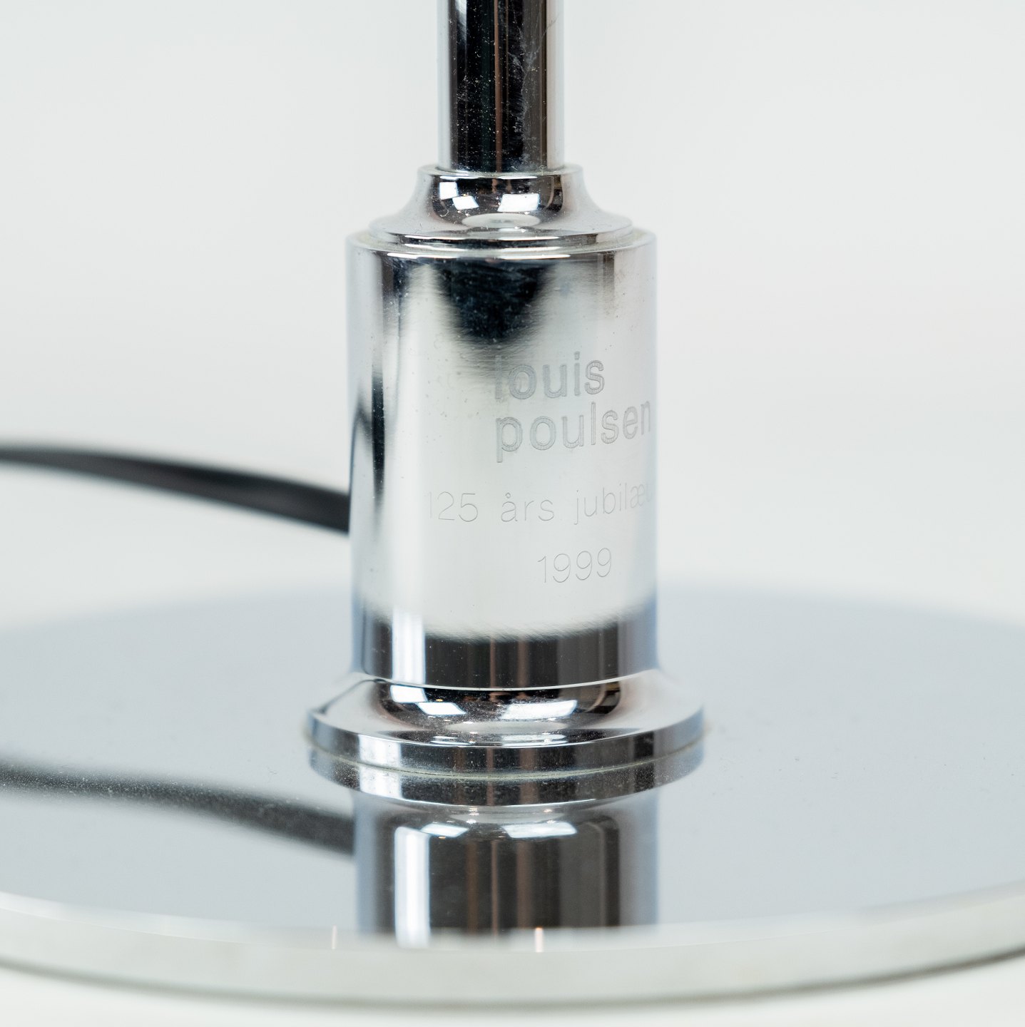 PH 3/2 table lamp with chrome stem and white opaline glass shades, designed by Poul Henningsen and manufactured by Louis Poulsen. The lamp was made in 1999 due to Poul Henningsen's 125th anniversary.