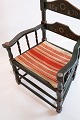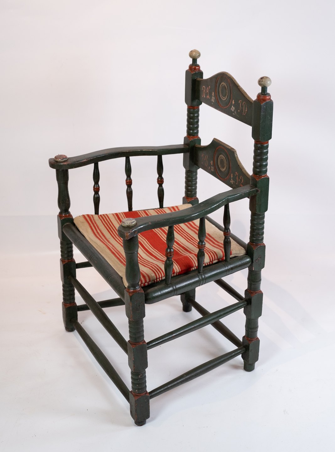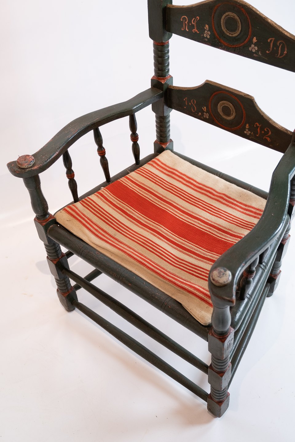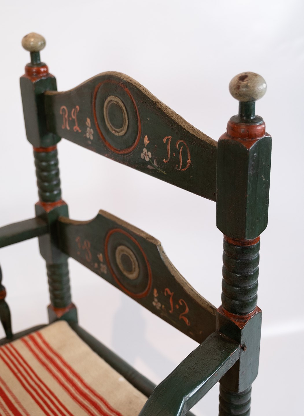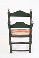 Antique green painted armchair upholstered with striped fabric. The chair is in great vintage condition from 1872.