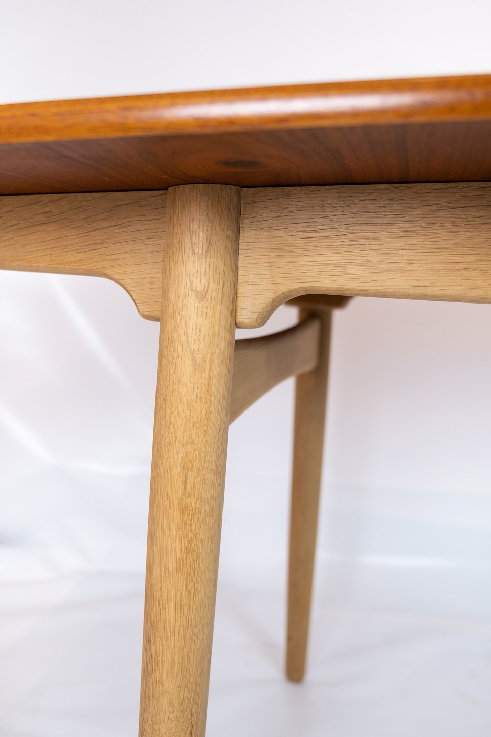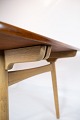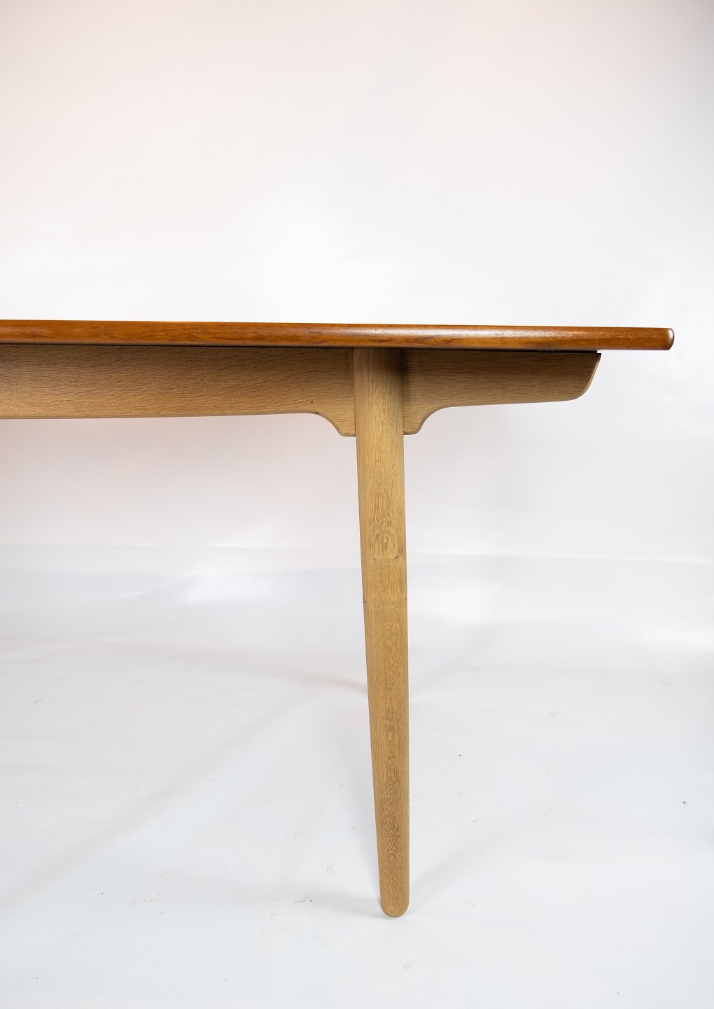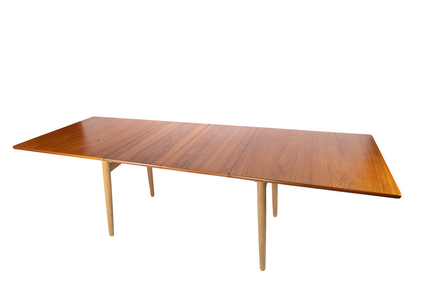 Spisebord i teak og eg med udtræk designet af Hans J. Wegner og fremstillet af Andreas Tuck.