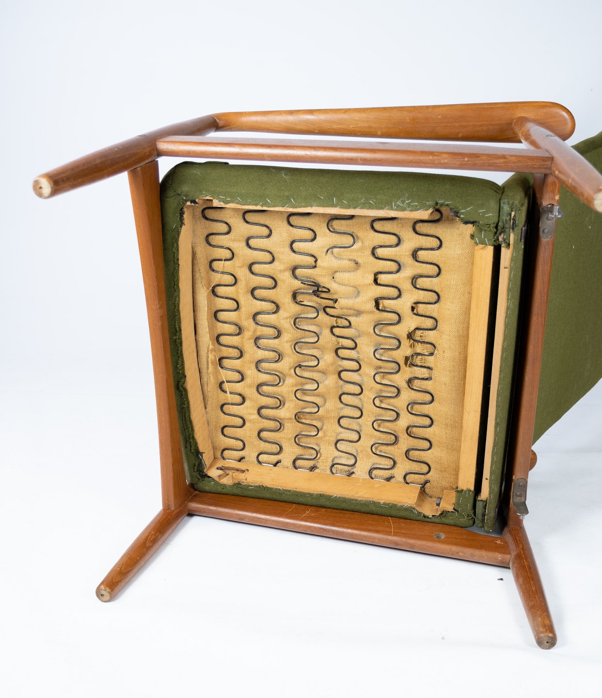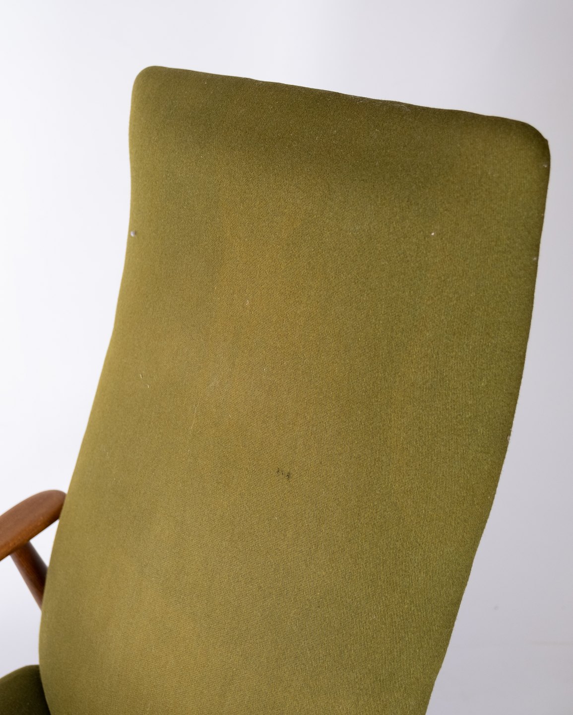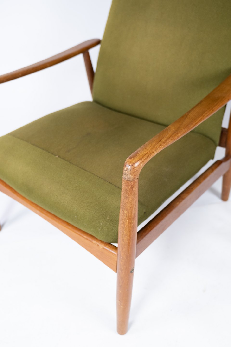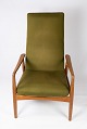 Denne hvilestol, designet af Alf Svensson og fremstillet af Fritz Hansen i 1960'erne, er et eksempel på tidløs elegance og komfort. Stolen er konstrueret i teaktræ og polstret med grønt stof, hvilket giver den et smukt og indbydende udseende.