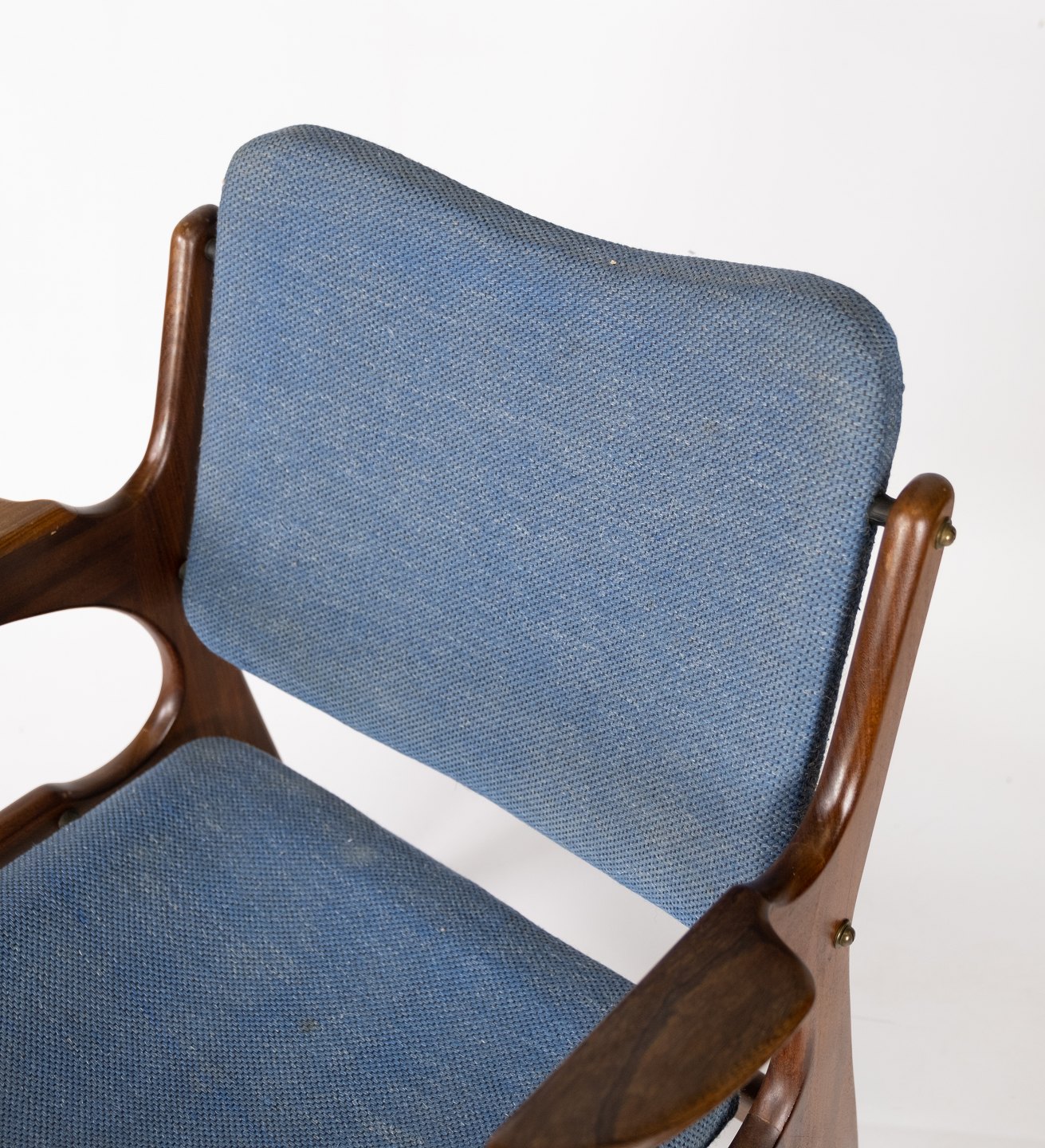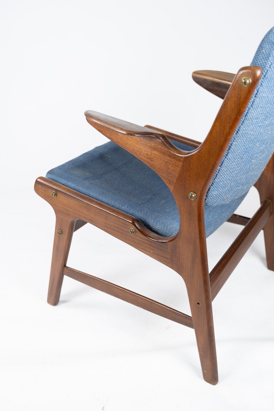 Armchair in teak and blue fabric, designed by Arne Hovmand Olsen in the 1960s, is a distinctive piece of furniture with a timeless aesthetic. The chair is a beautiful example of the Danish design tradition and is known for its simple elegance and comfortable design.