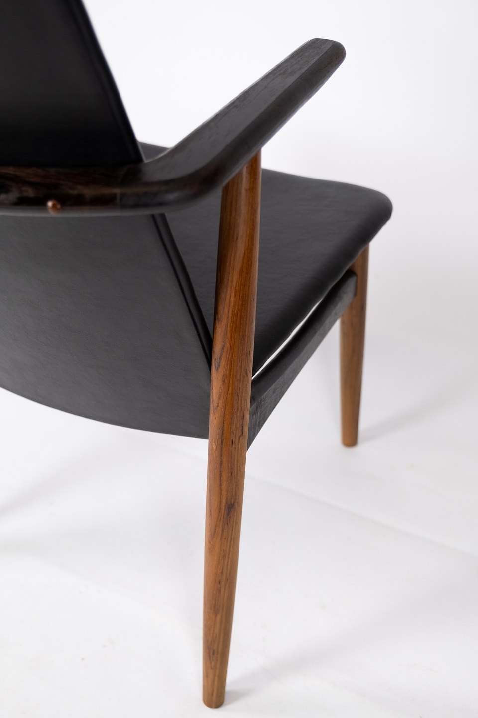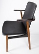 Dette par armstole i klassisk sort læder og teak, designet af Hans Olsen fra 1960'erne, udstråler en tidløs elegance og enestående håndværk. Stolene er ikke kun funktionelle, men også et smukt eksempel på dansk designarv, der vil tilføre enhver indretning en sofistikeret og stilfuld atmosfære.