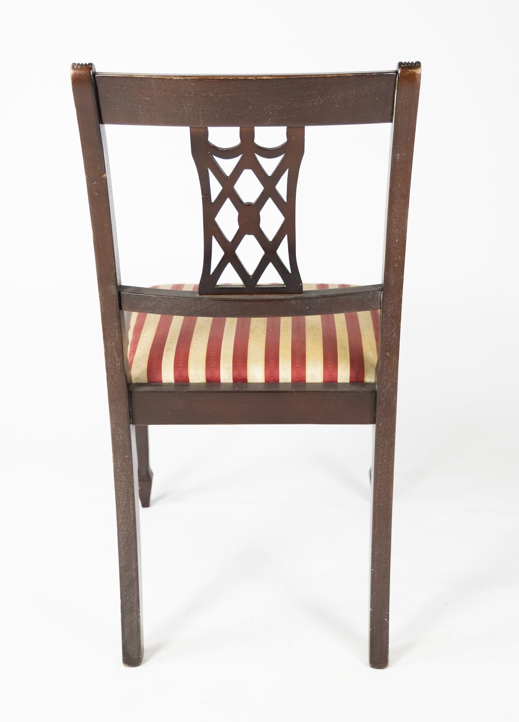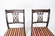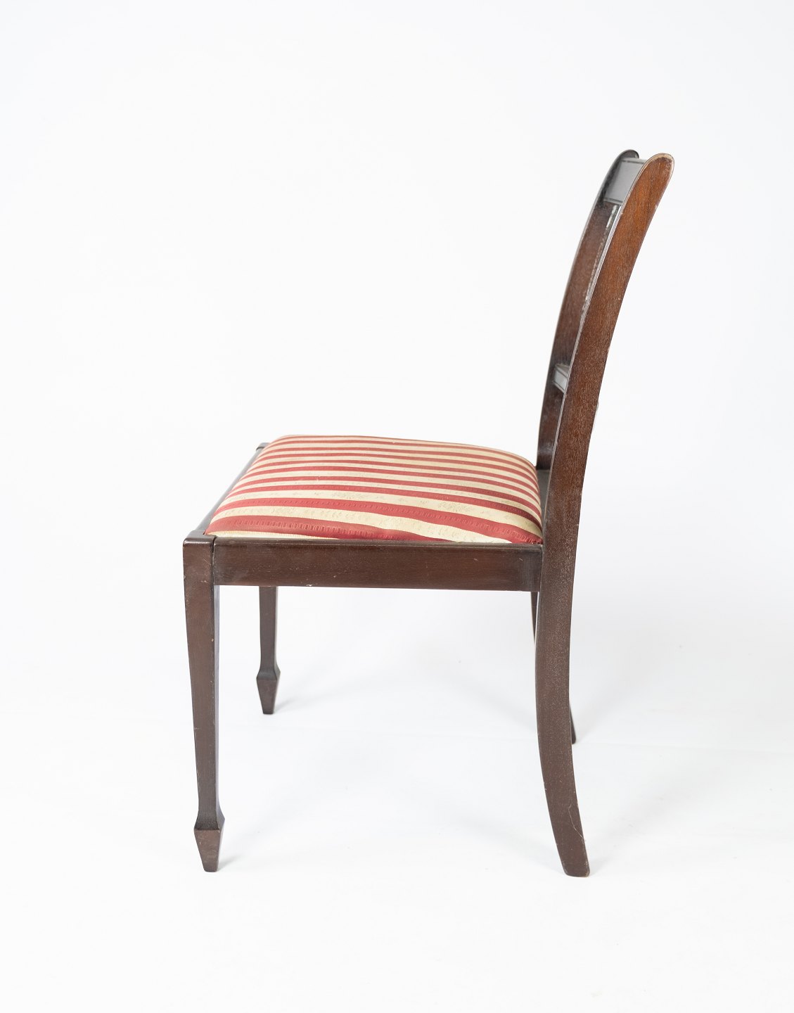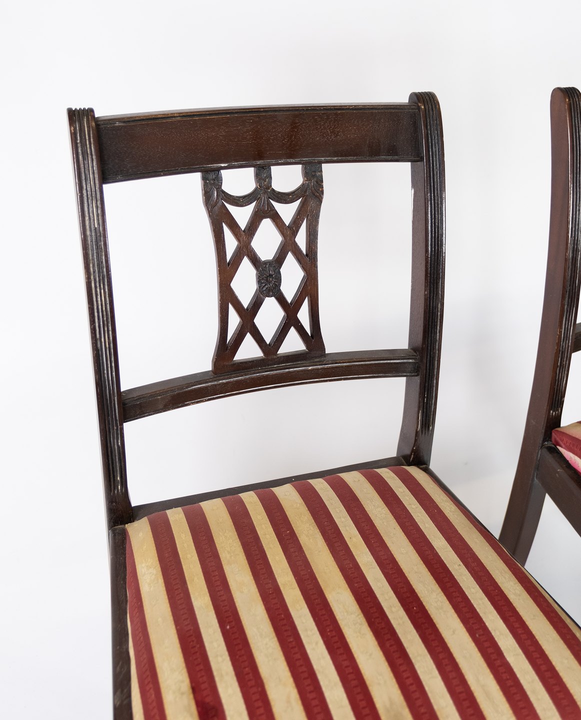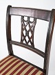 Et sæt spisestuestole af mahogni og polstret med stribet stof fra 1960erne. Stolene er i flot brugt stand.