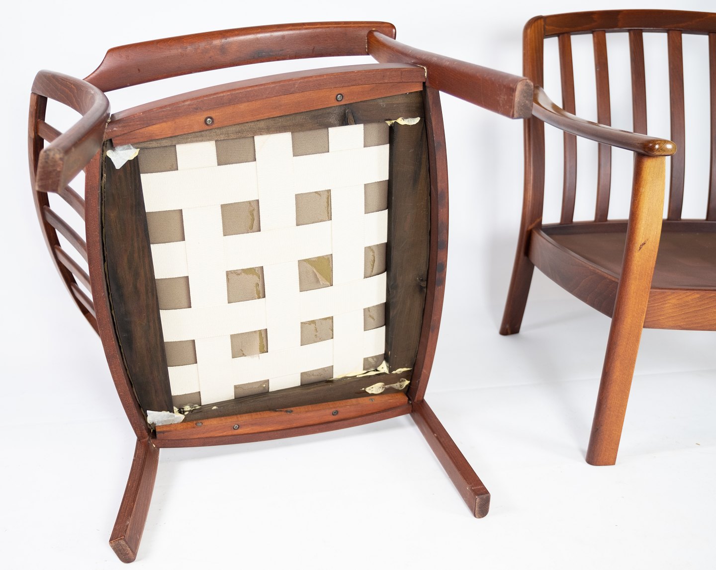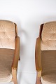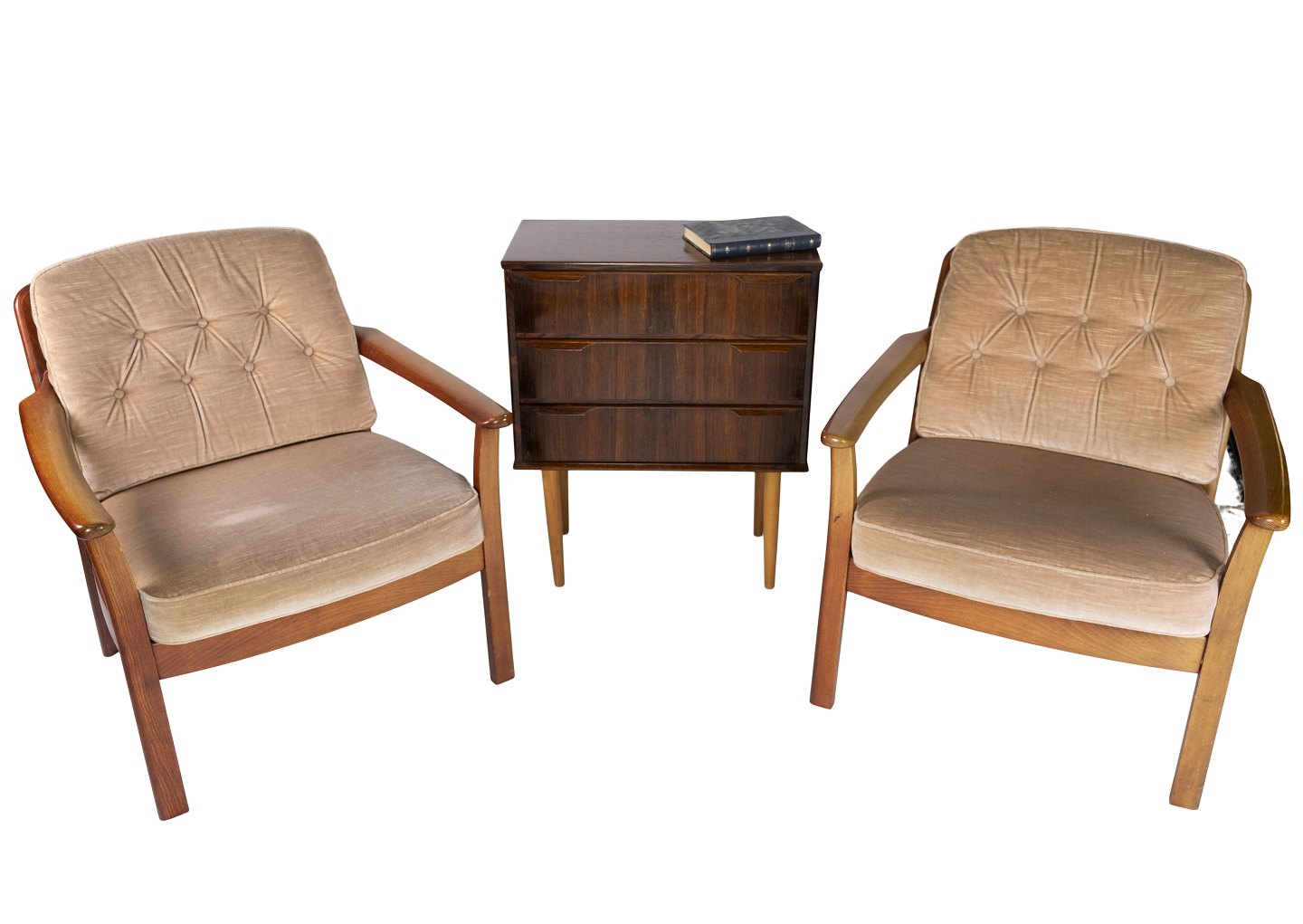 Dette sæt hvilestole i poleret træ og hynder i velour, fra 1960'erne, er et smukt udtryk for dansk håndværk og æstetik. Med deres elegante design og luksuriøse polstring er disse stole både behagelige og stilfulde.