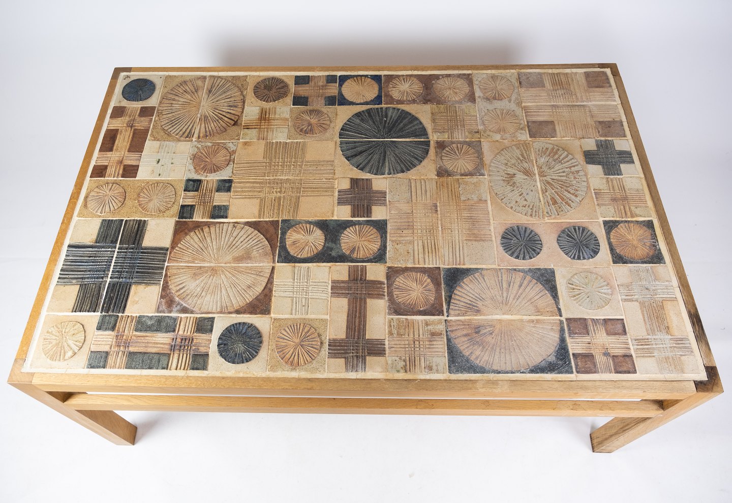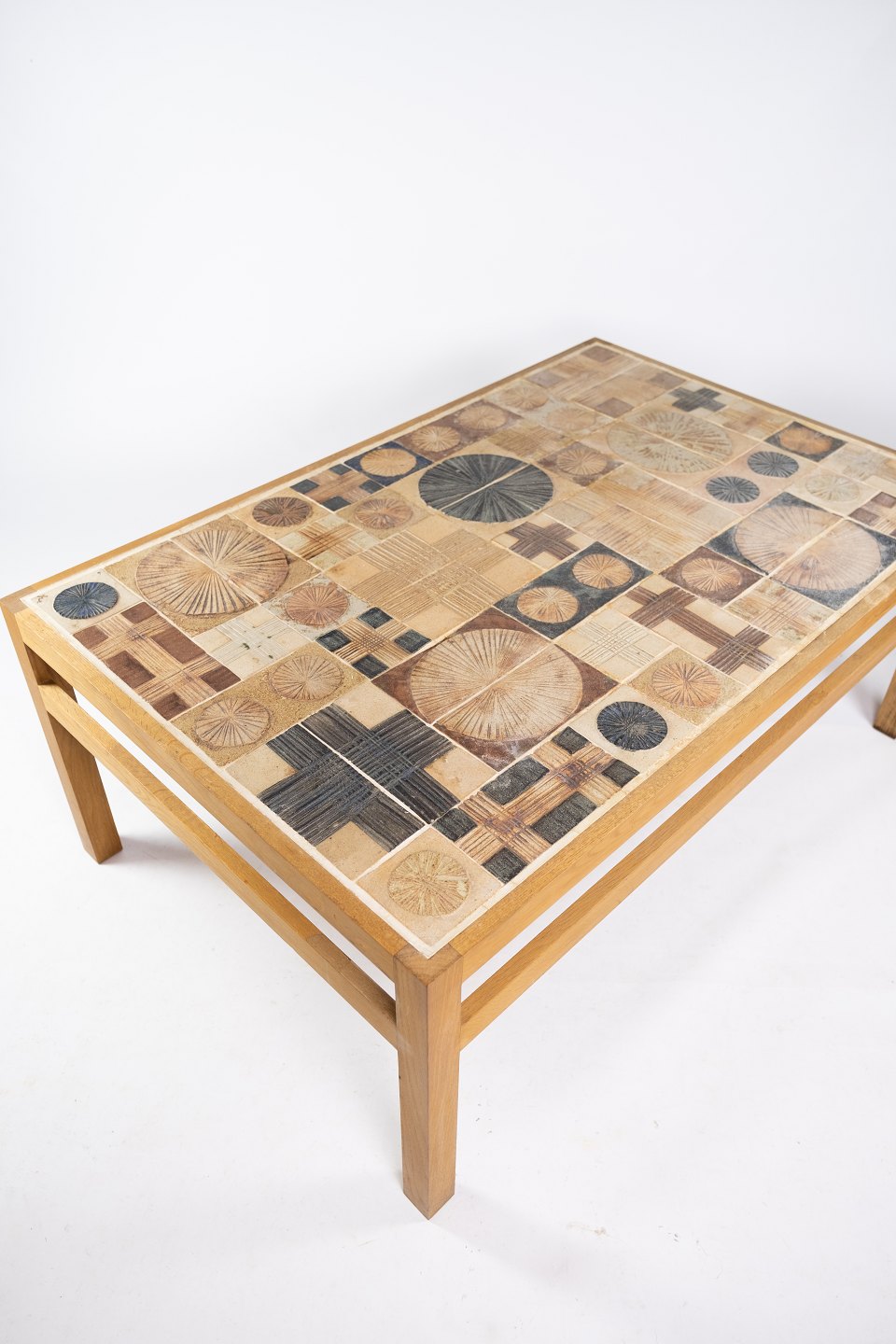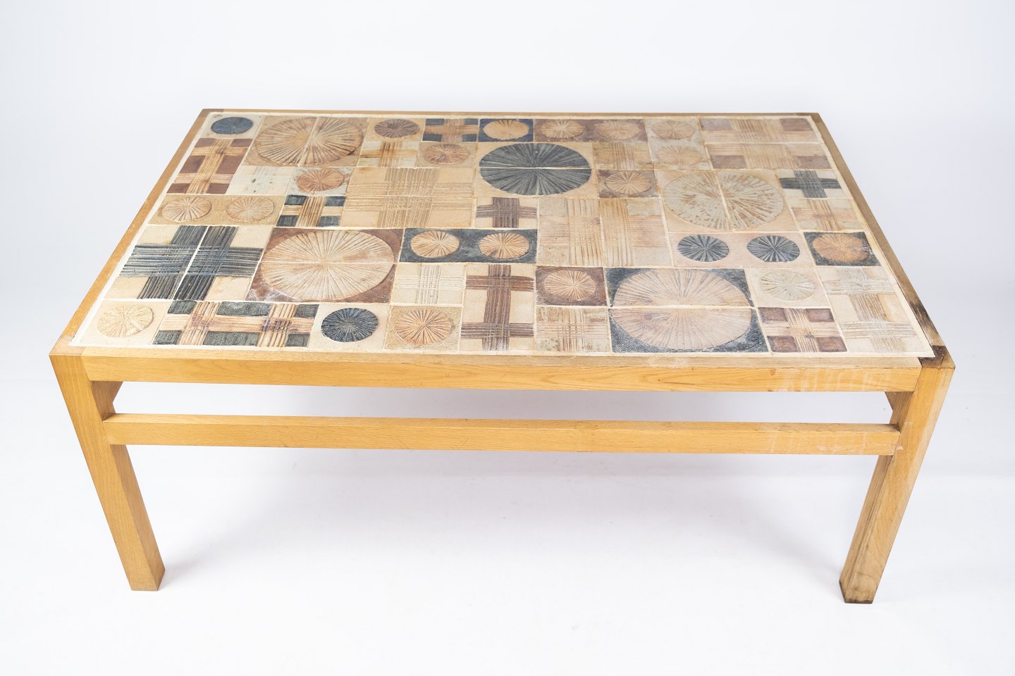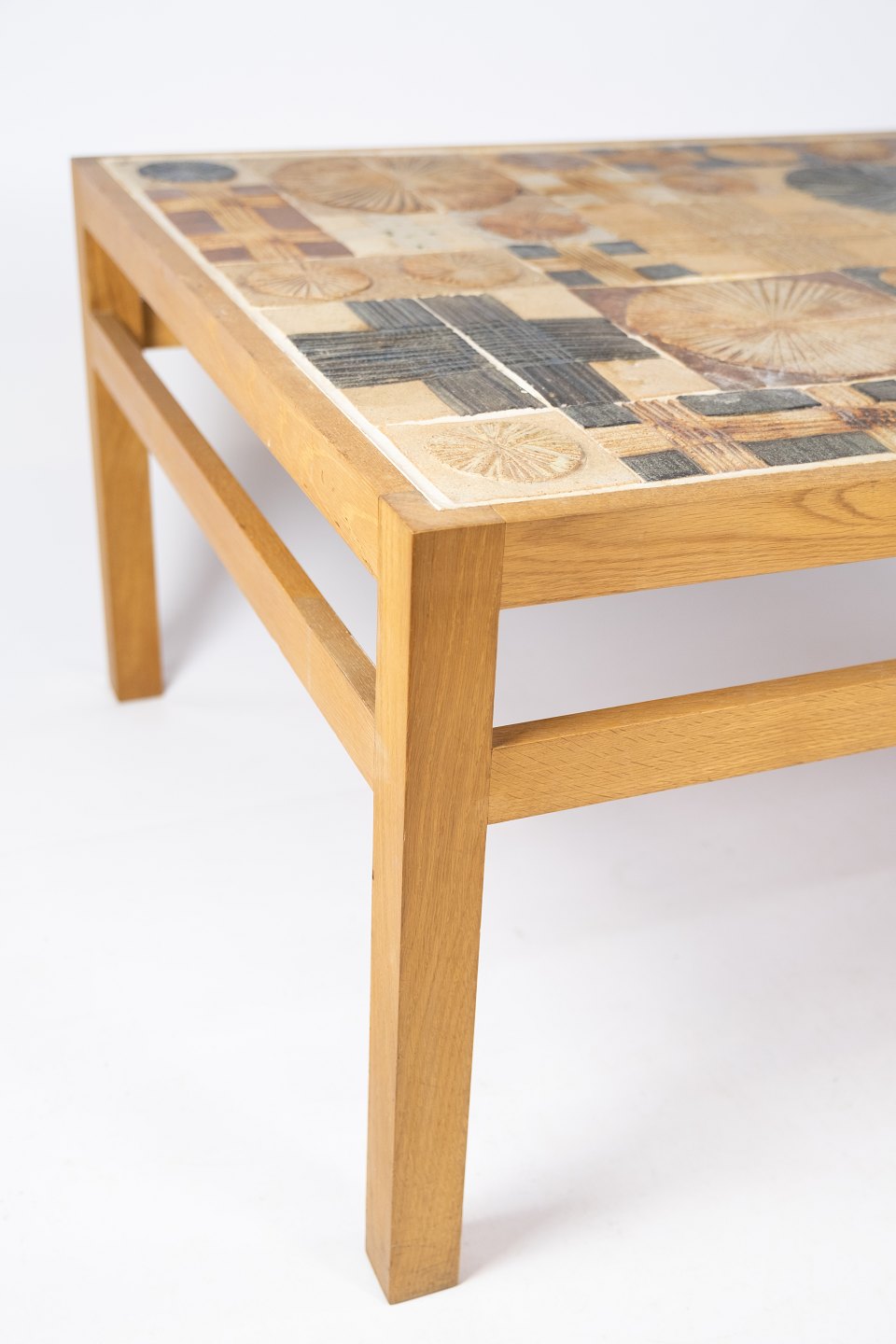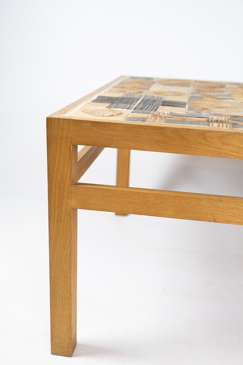 Coffee table in oak and with different tiles, designed by Tue Poulsen from the 1970s. The table is in great vintage condition.