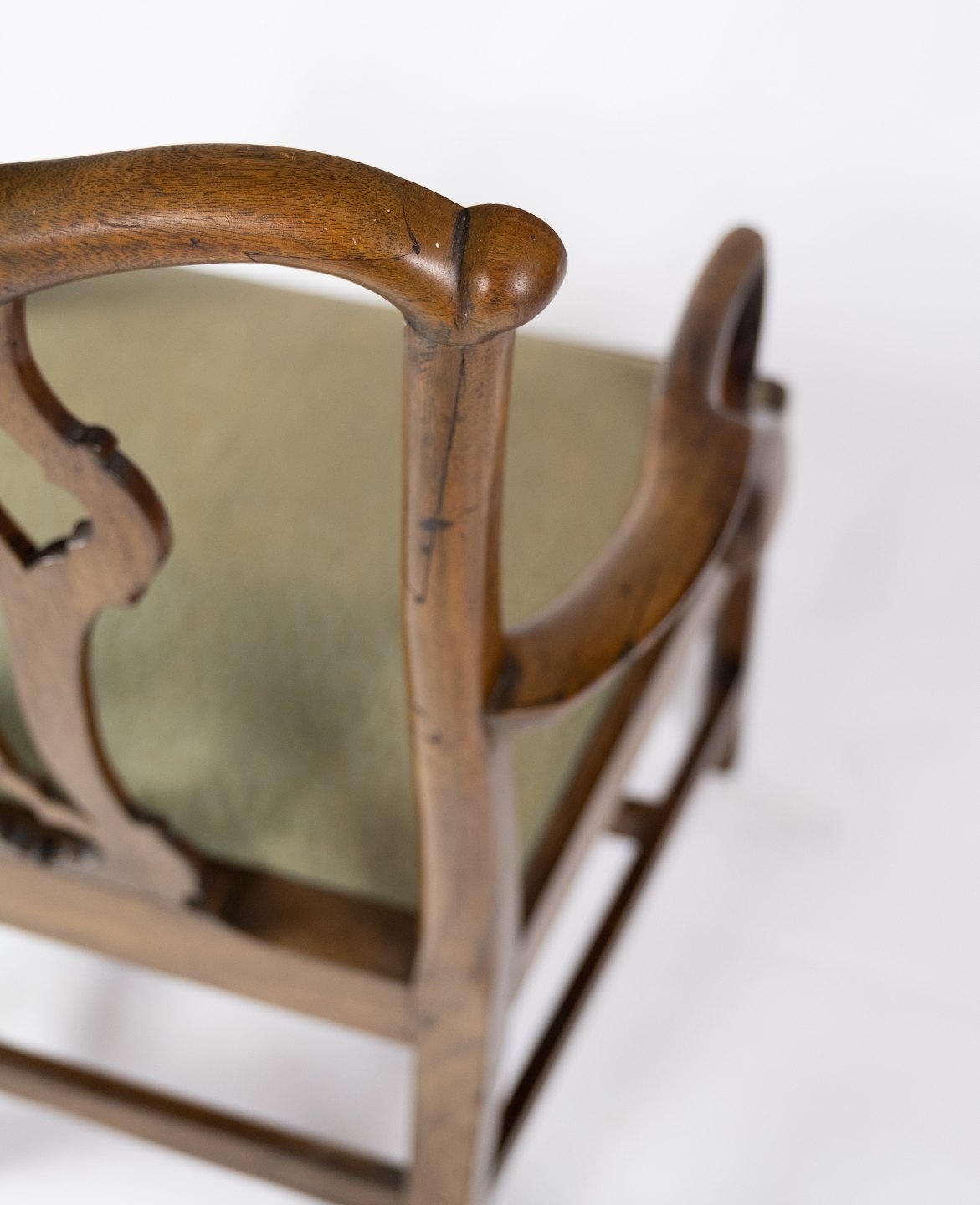 Antique armchair of light mahogany and upholstered with green wool fabric from the 1890s. The chair is in great vintage condition.
