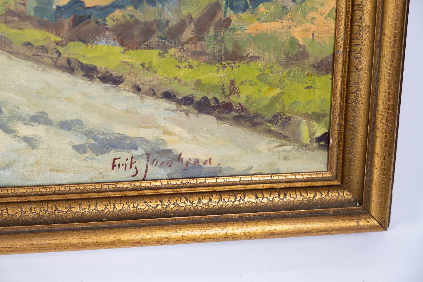 Oil painting with forrest motif and gilded frame, signed Frits Jacobsen.