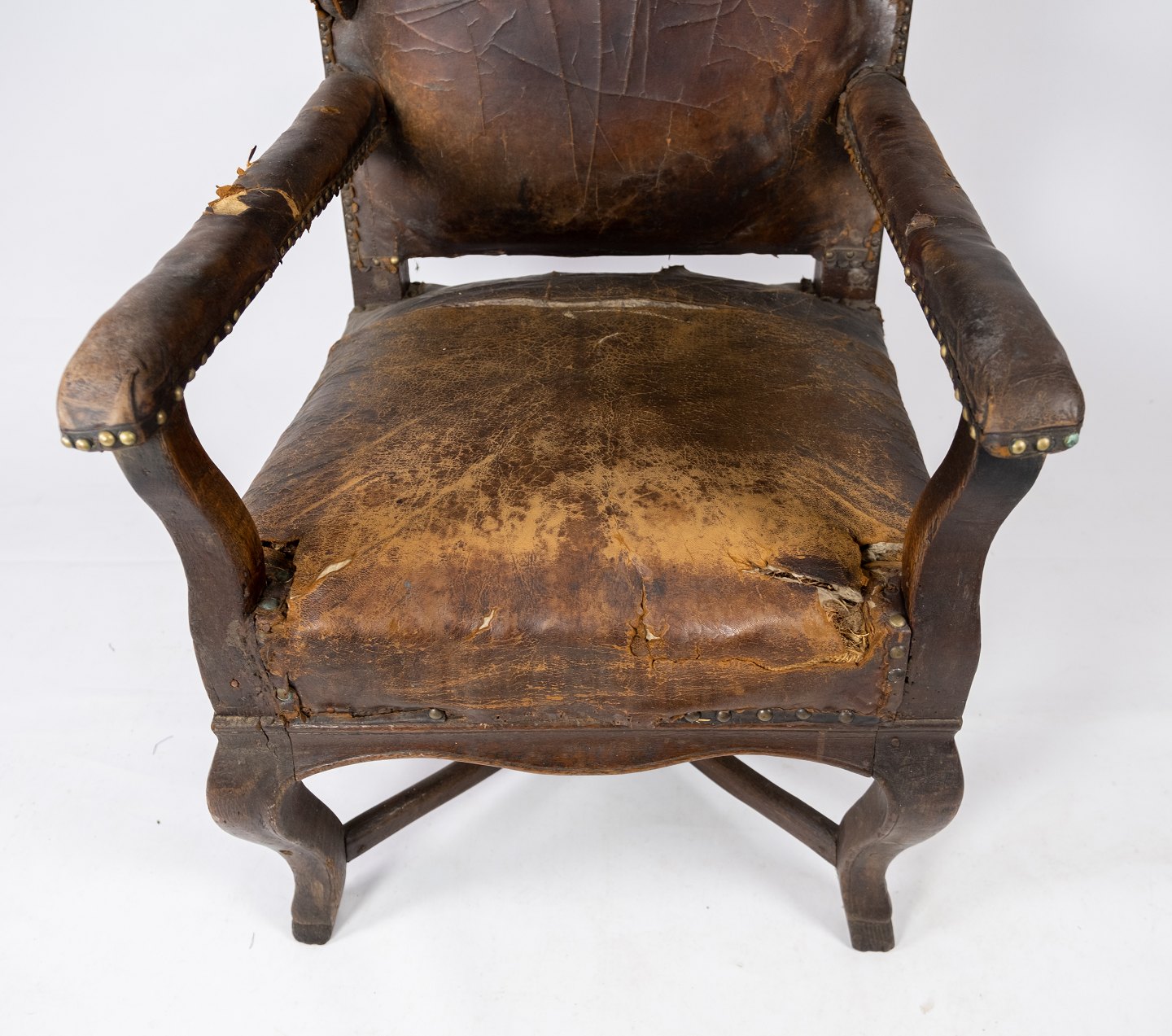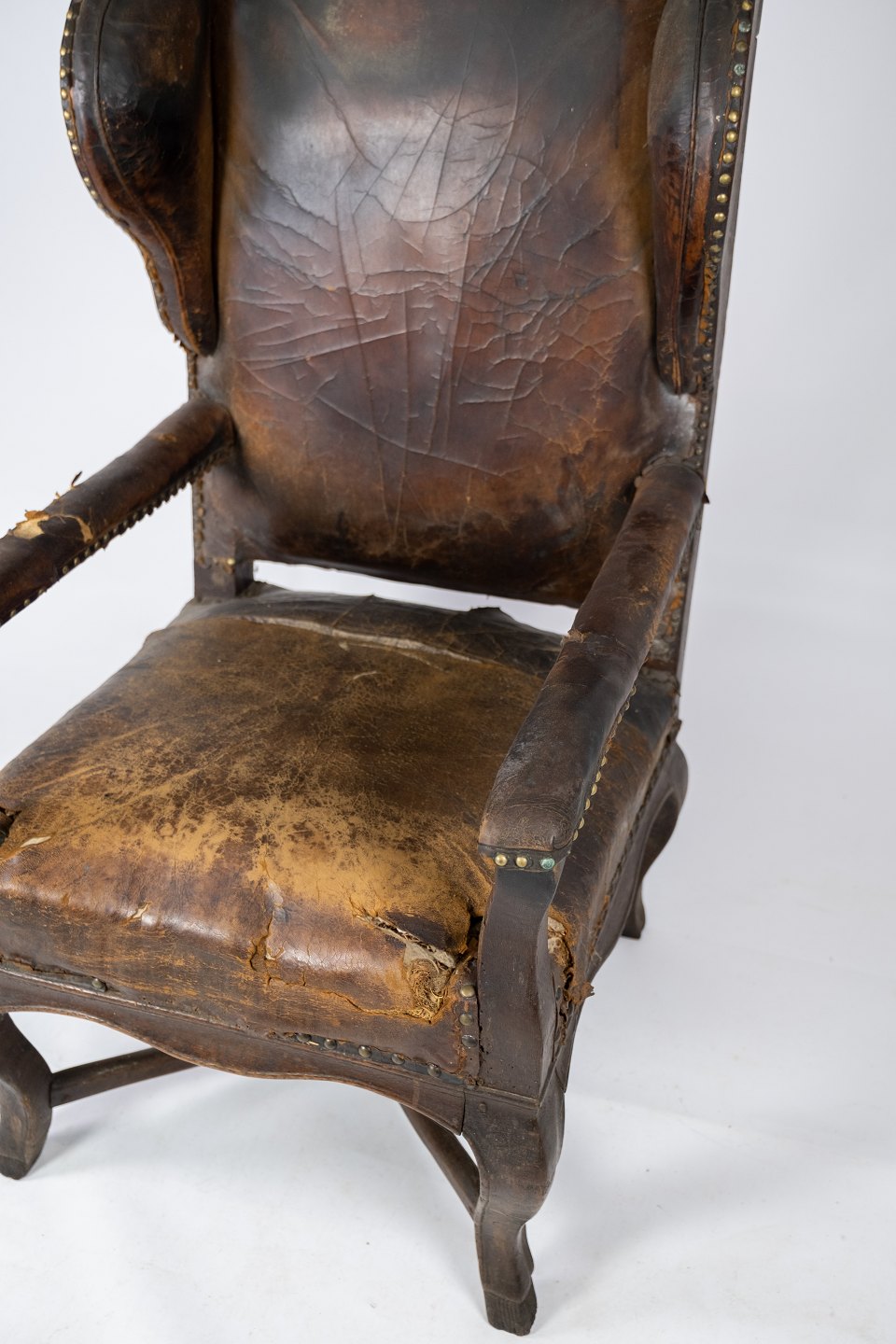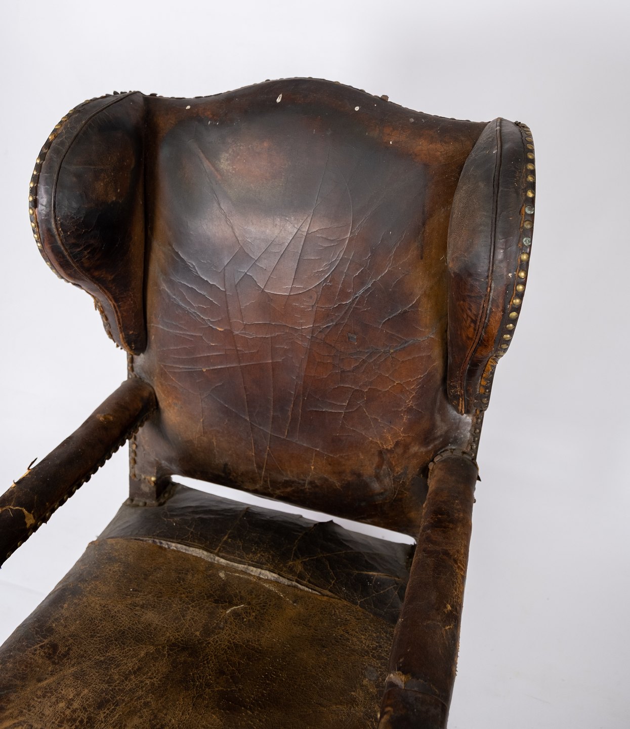 Antique armchair with original dark brown leather, in great condition from 1790.