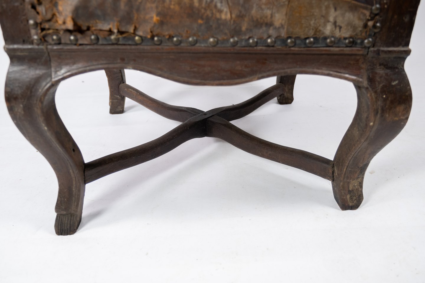 Antique armchair with original dark brown leather, in vintage condition from 1790.
