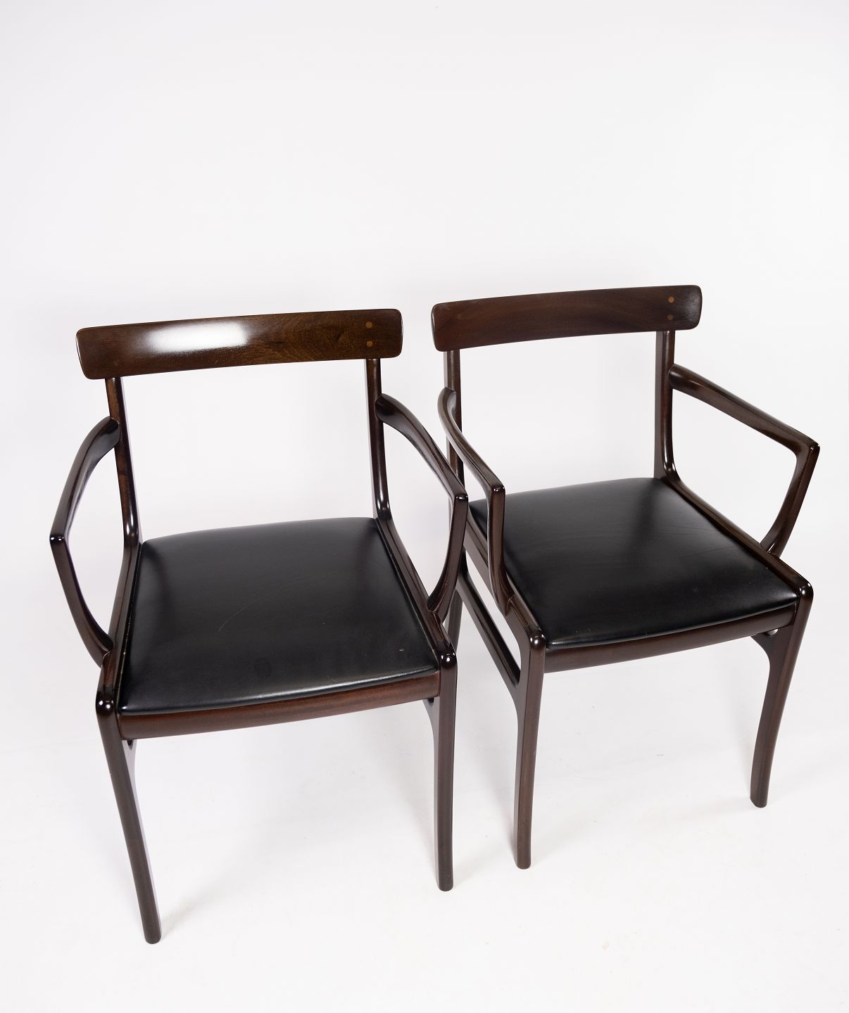 Et par Rungstedlund armstole, fremstillet af mahogni og beklædt med sort læder, er et strålende eksempel på Ole Wanschers tidløse design, der kombinerer æstetik og funktionalitet på en sublim måde.