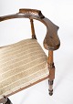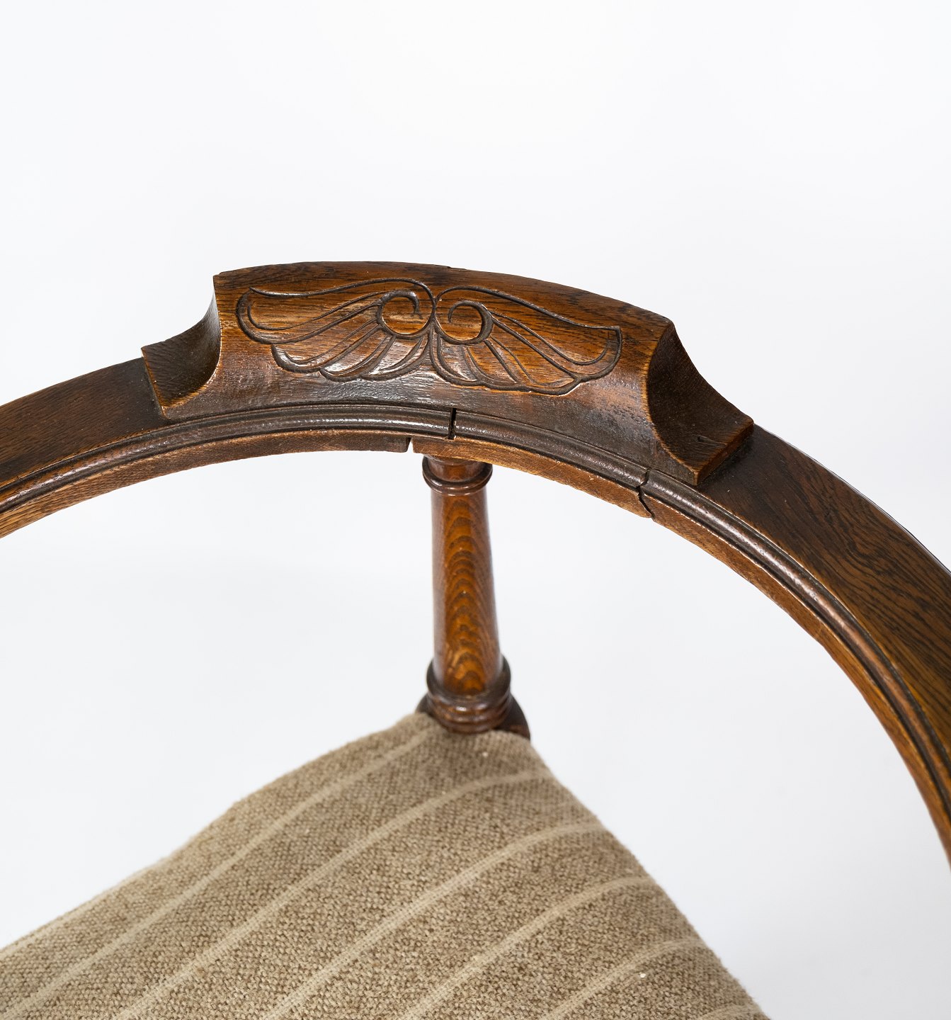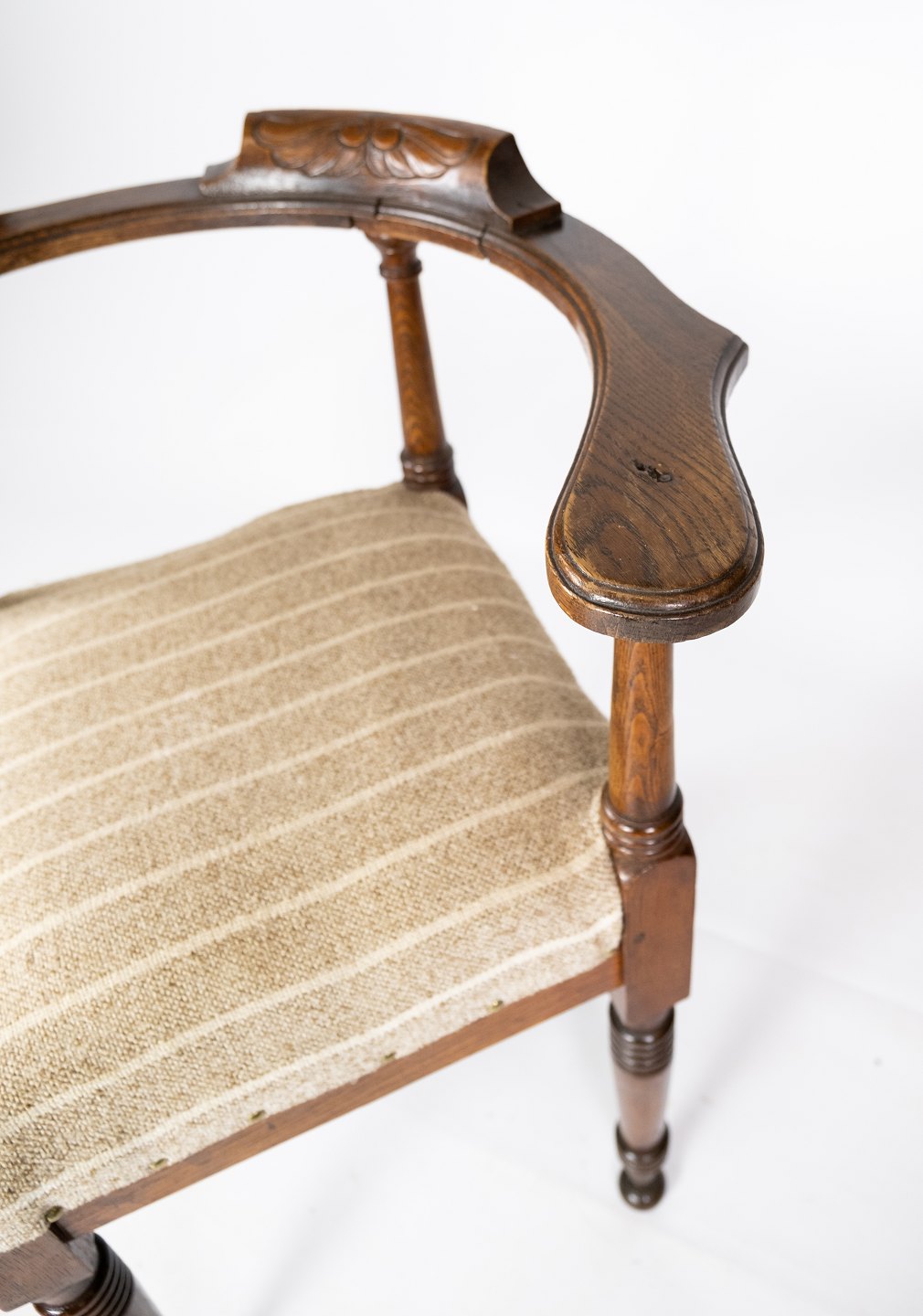 Antik armstol af eg og polstret med lyst stof fra 1930erne. Stolen er i flot antik stand.