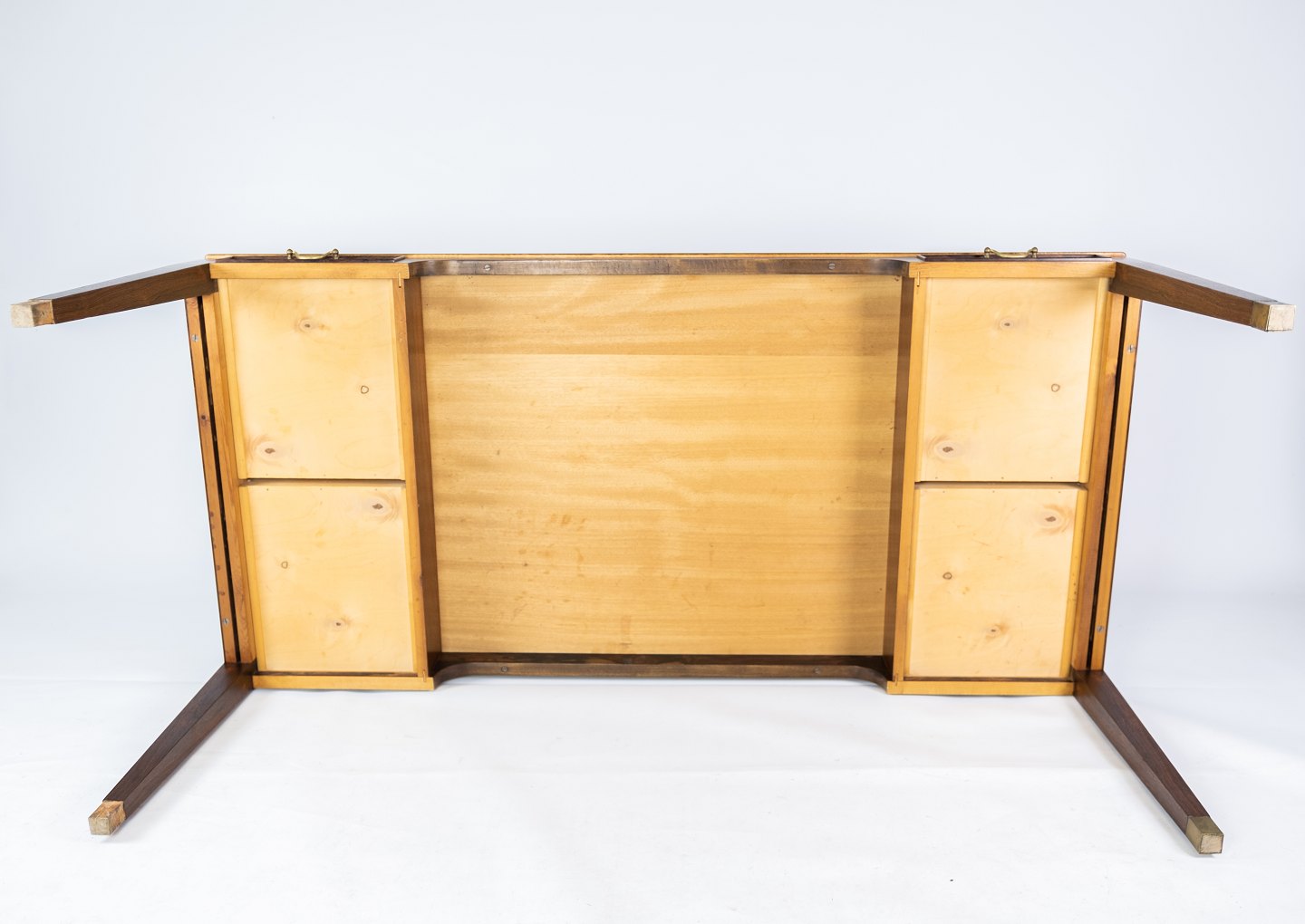 Dette sofabord i palisander, designet af Ole Wanscher i 1960'erne, er et fremragende eksempel på mid-century modern dansk design. Ole Wanscher, en af Danmarks mest anerkendte møbeldesignere, er kendt for sine elegante og funktionelle møbler, der kombinerer traditionelt håndværk med moderne æstetik.