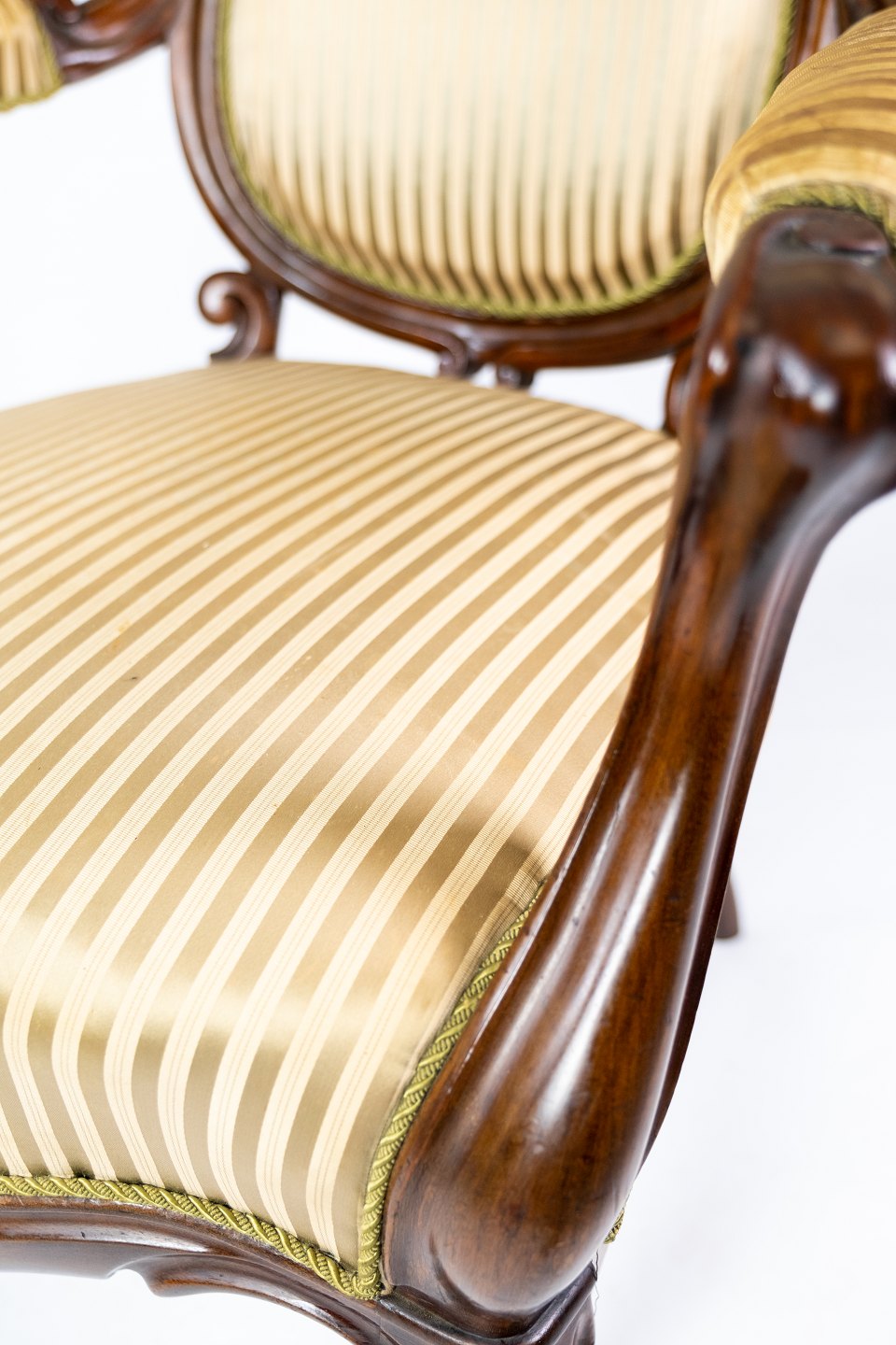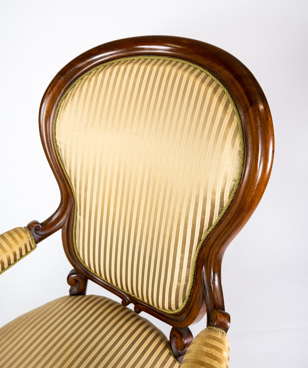 SoldAntique rococo armchair of mahogany and upholstered with striped fabric from the 1860s.