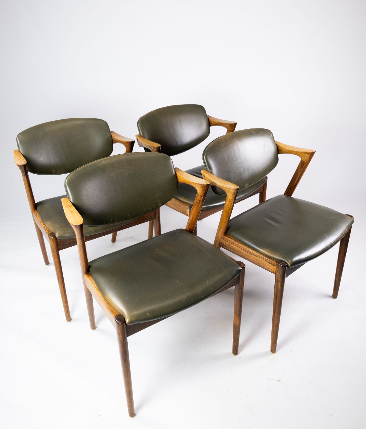 Model 42 er karakteriseret ved sine rene linjer, ergonomiske former og fremragende håndværk. Stolenes elegante og funktionelle design gør dem ideelle til både moderne og klassiske indretninger. Det let skrånende ryglæn og de polstrede sæder sikrer optimal siddekomfort, mens de solide trærammer giver langvarig holdbarhed.