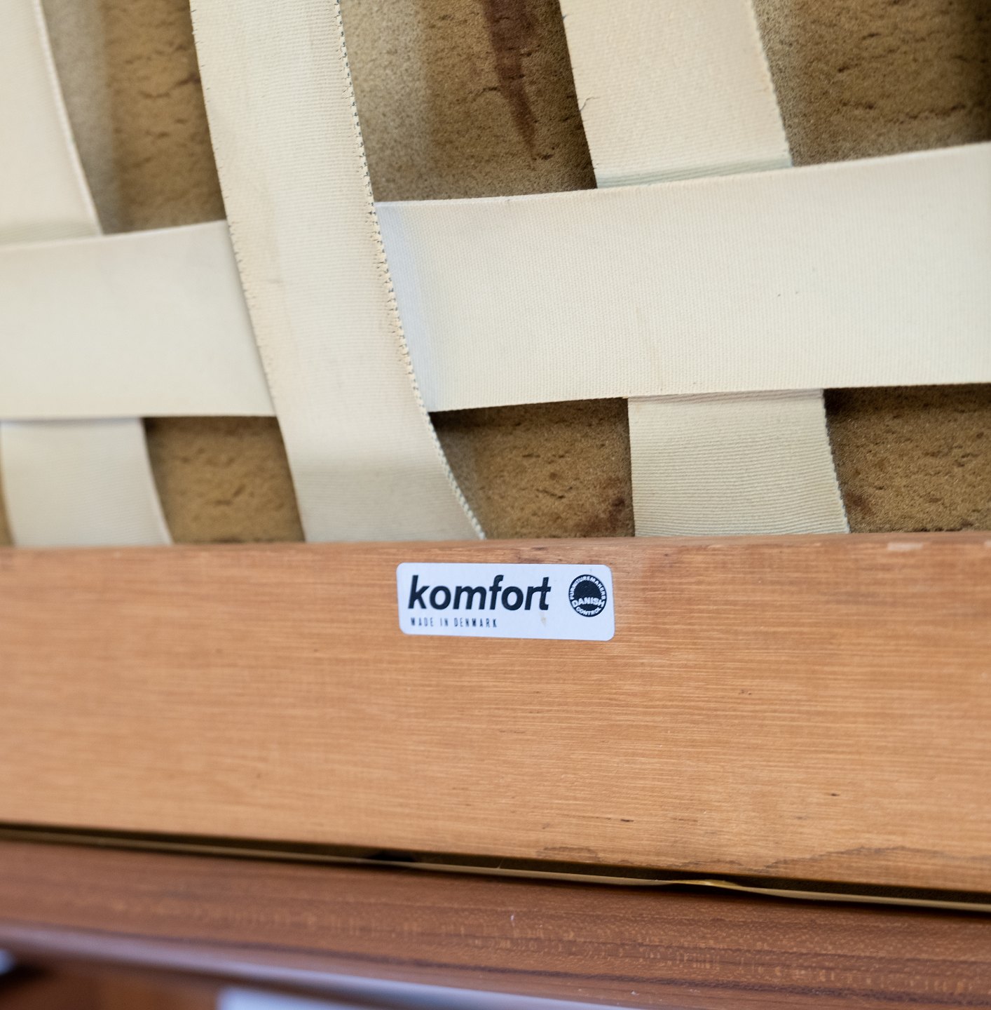 Denne lænestol og skammel sætter et smukt præg på ethvert rum med sit tidløse design og enestående håndværk. Designet af den anerkendte Arne Vodder og produceret af Komfort i 1960'erne, er dette sæt et ikon inden for dansk møbeldesign.