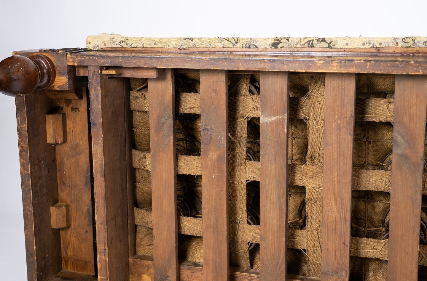 Late Empire sofa of mahogany and upholstered with light fabric, in great antique condition from the 1840s.