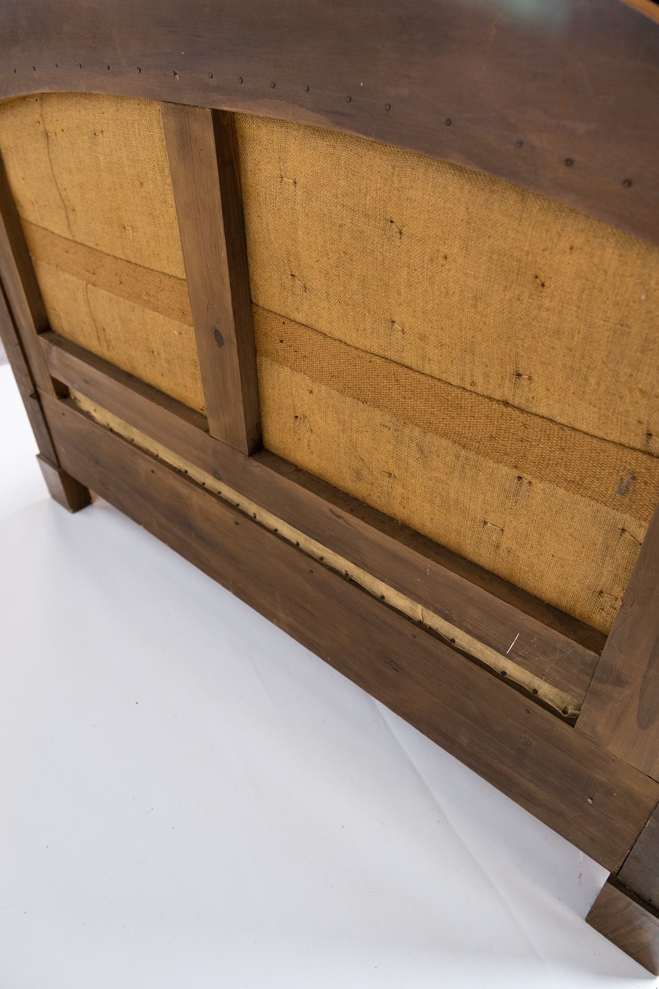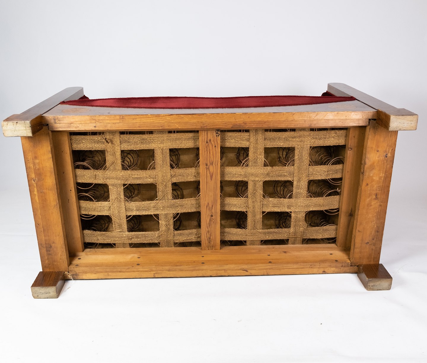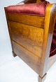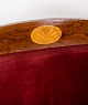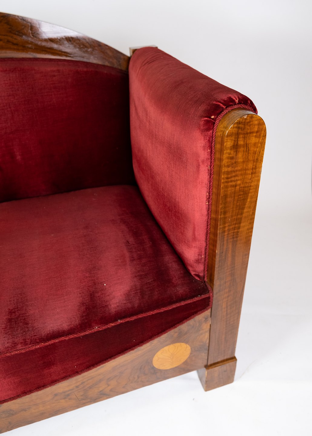 To personers sofa af valnød med intarsia og polstret med rød velour fra omkring 1910. Sofaen er i flot brugt stand.