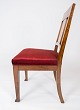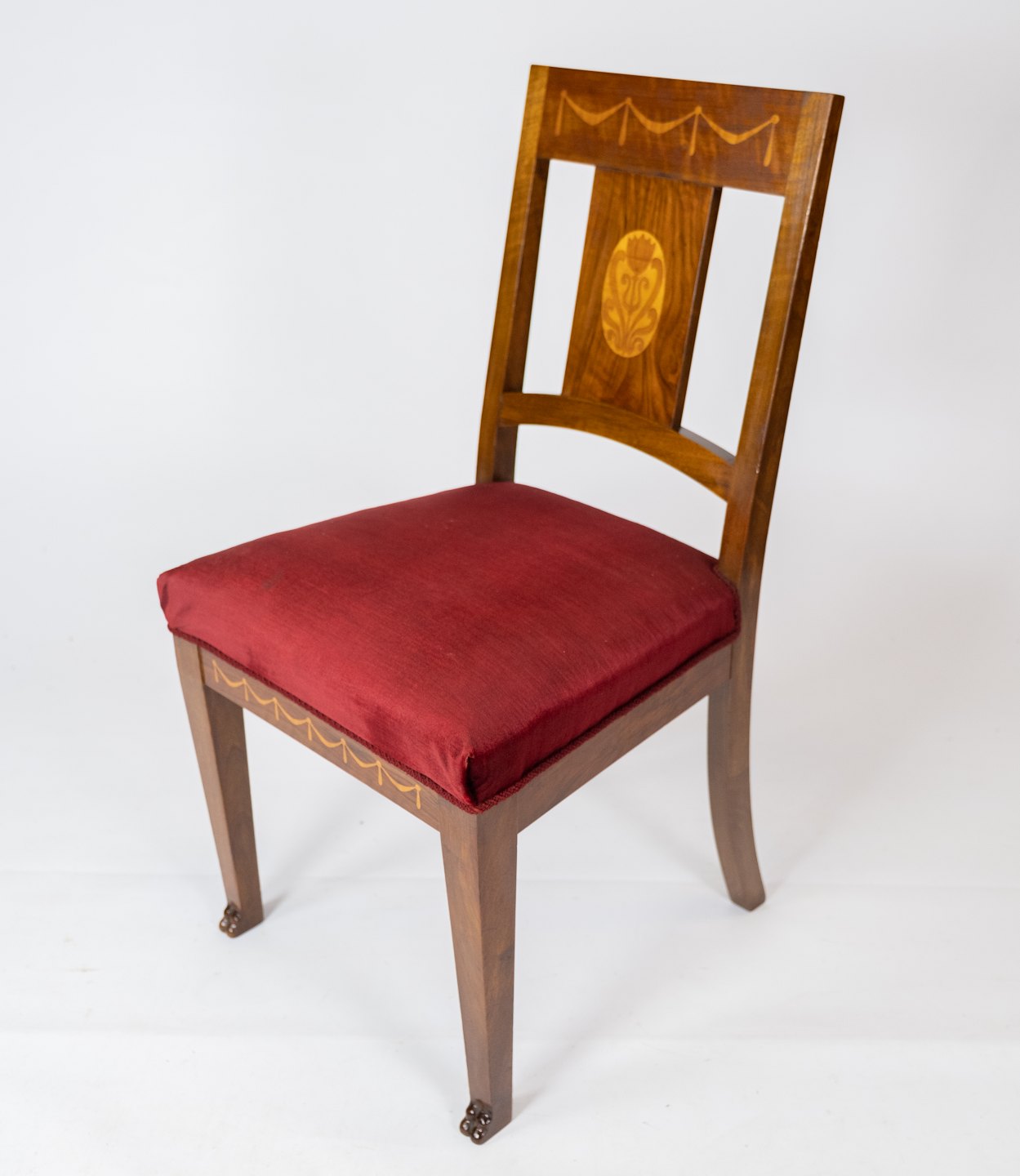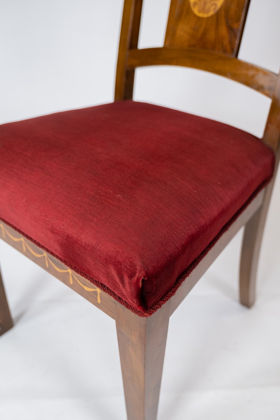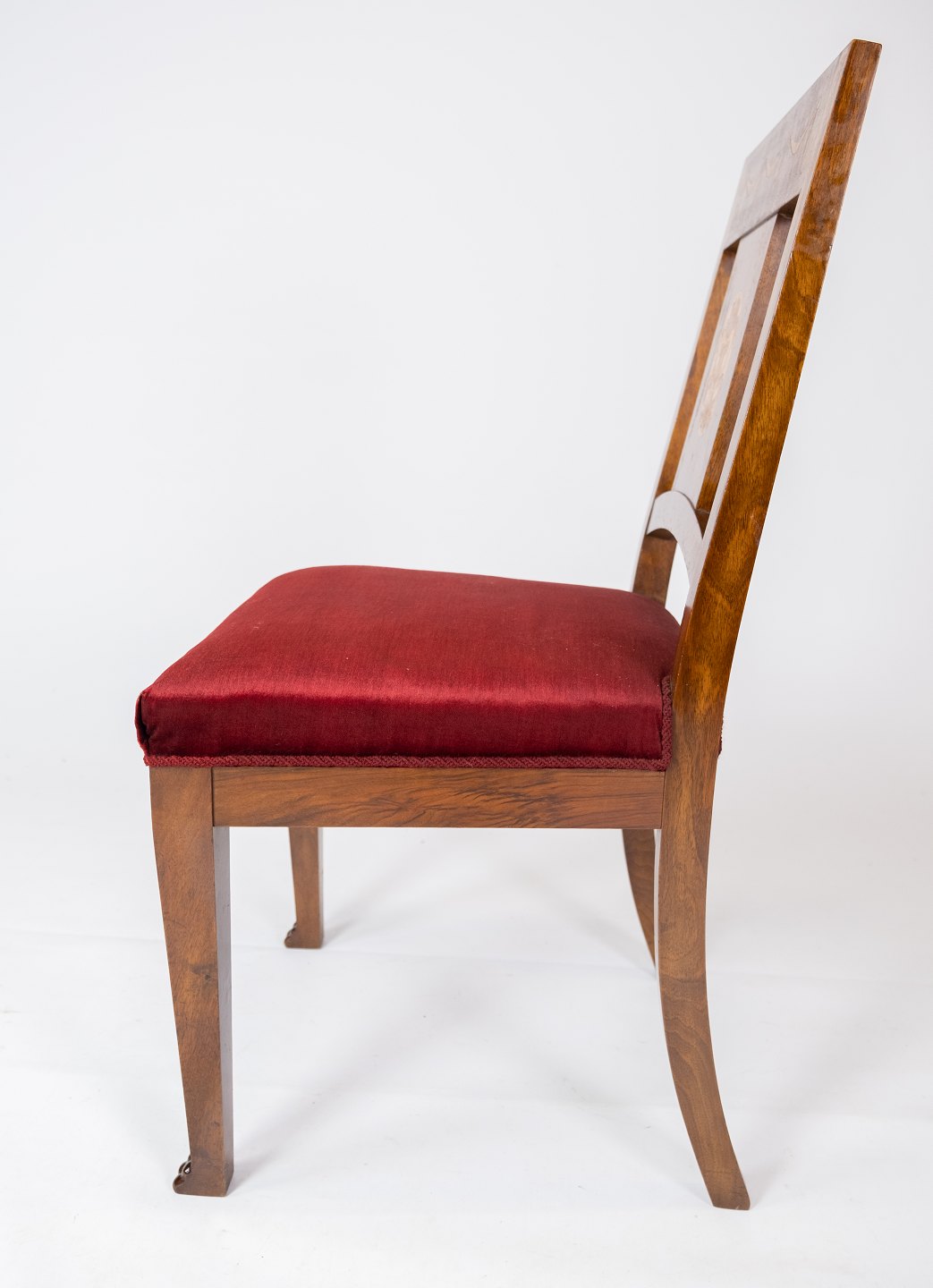 Sæt af fire spisestuestole af valnød med intarsia og polstret med rødt velour fra omkring 1910. Stolene er i flot brugt stand.
