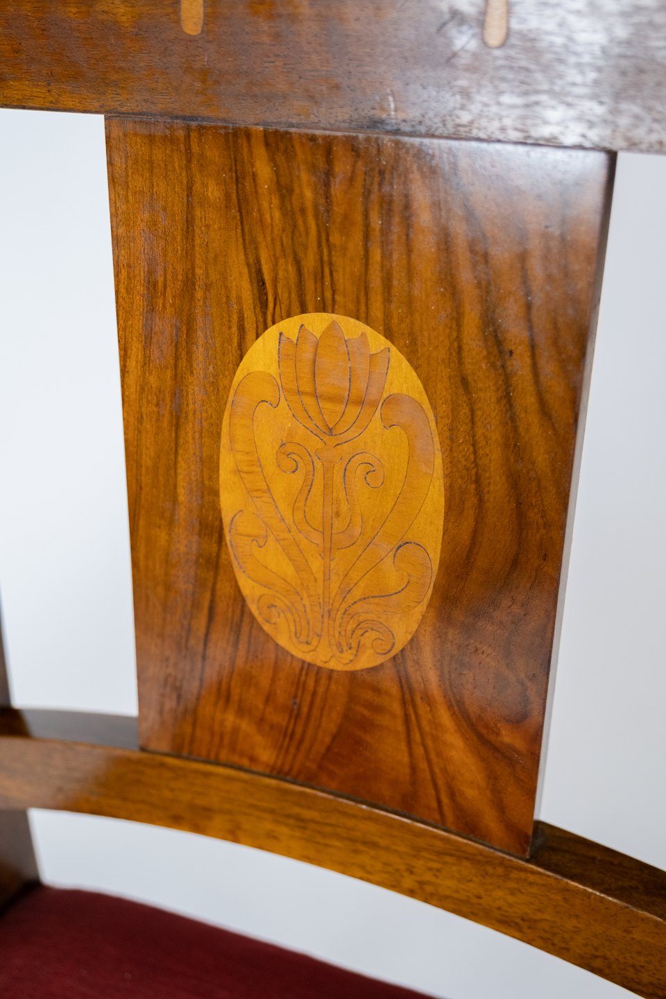 Sæt af fire spisestuestole af valnød med intarsia og polstret med rødt velour fra omkring 1910.
