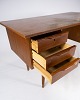 Dette skrivebord er et smukt eksempel på dansk design fra 1960'erne, fremstillet af teaktræ, hvilket giver det et naturligt og tidløst udseende. Den smukke gyldne farve og unikke træmønster tilføjer karakter og varme til ethvert rum. Med sit enkle og elegante design passer skrivebordet sømløst ind i både moderne og klassiske indretninger.
