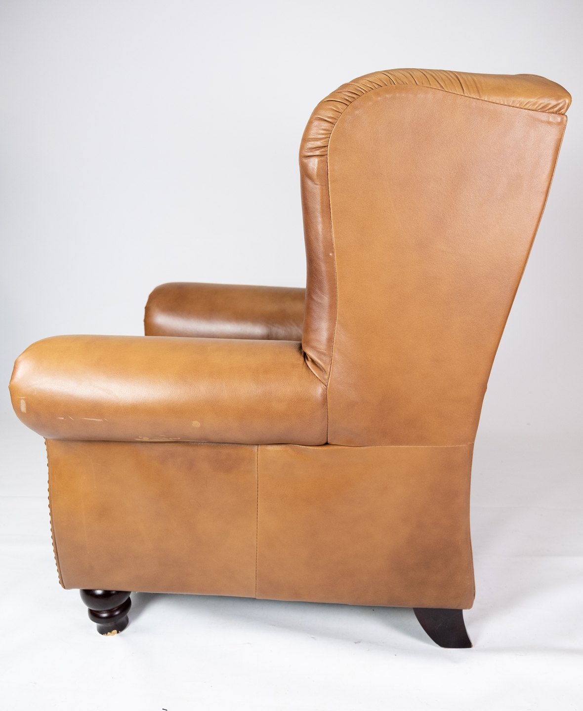 Stor hvilestole/øreklapstol i cognacfarvet læder.