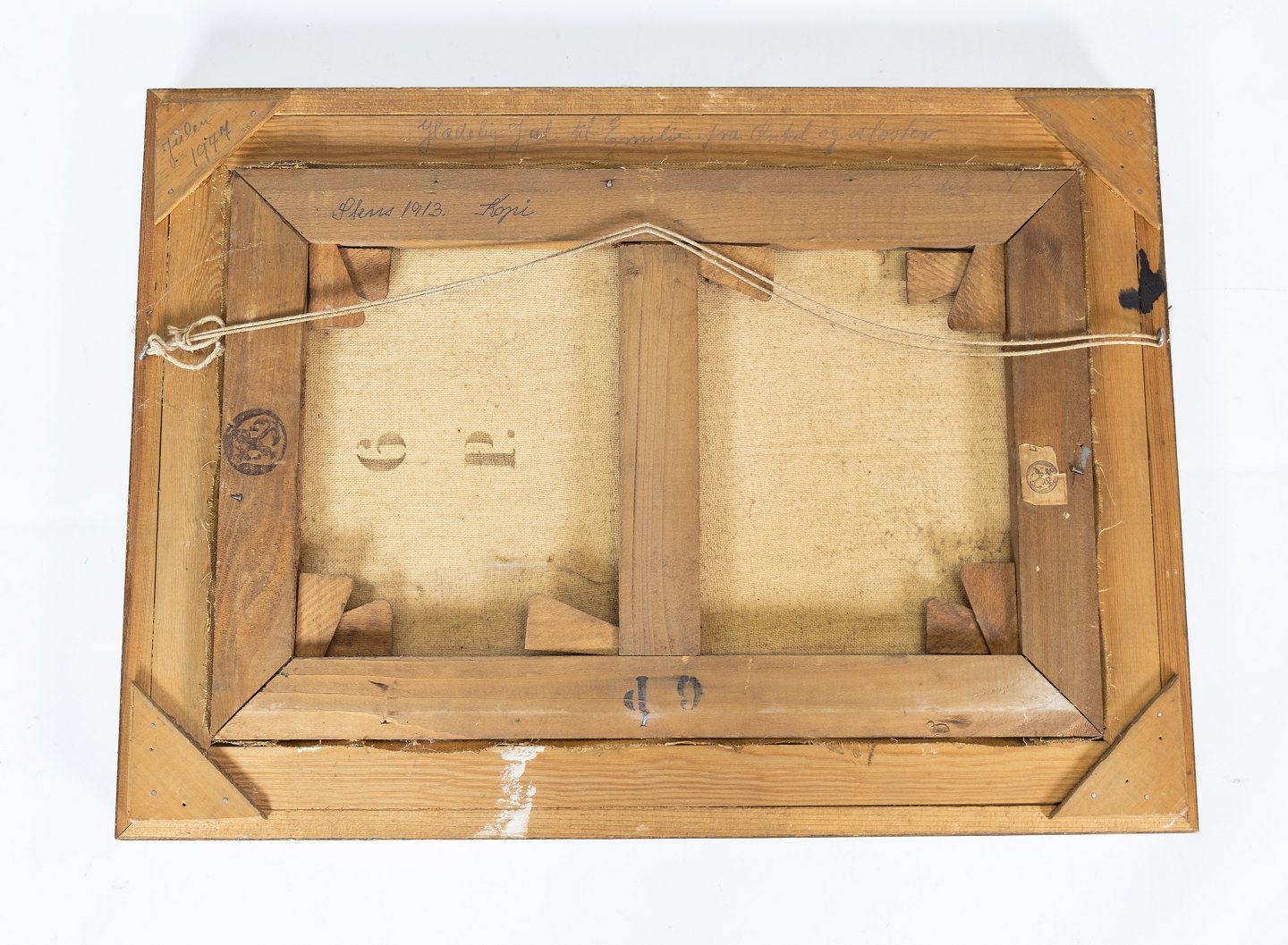 Oliemaleri med strandmotiv og forgyldt ramme, signeret A.T. 1947.