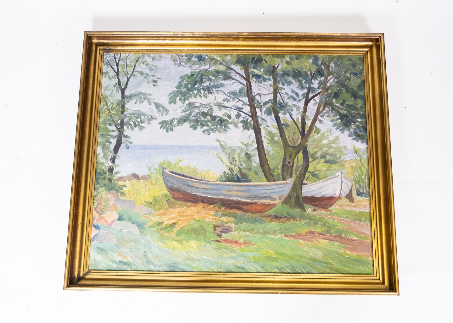 Oliemaleri med motiv af robåde og med forgyldt ramme fra 1920erne.