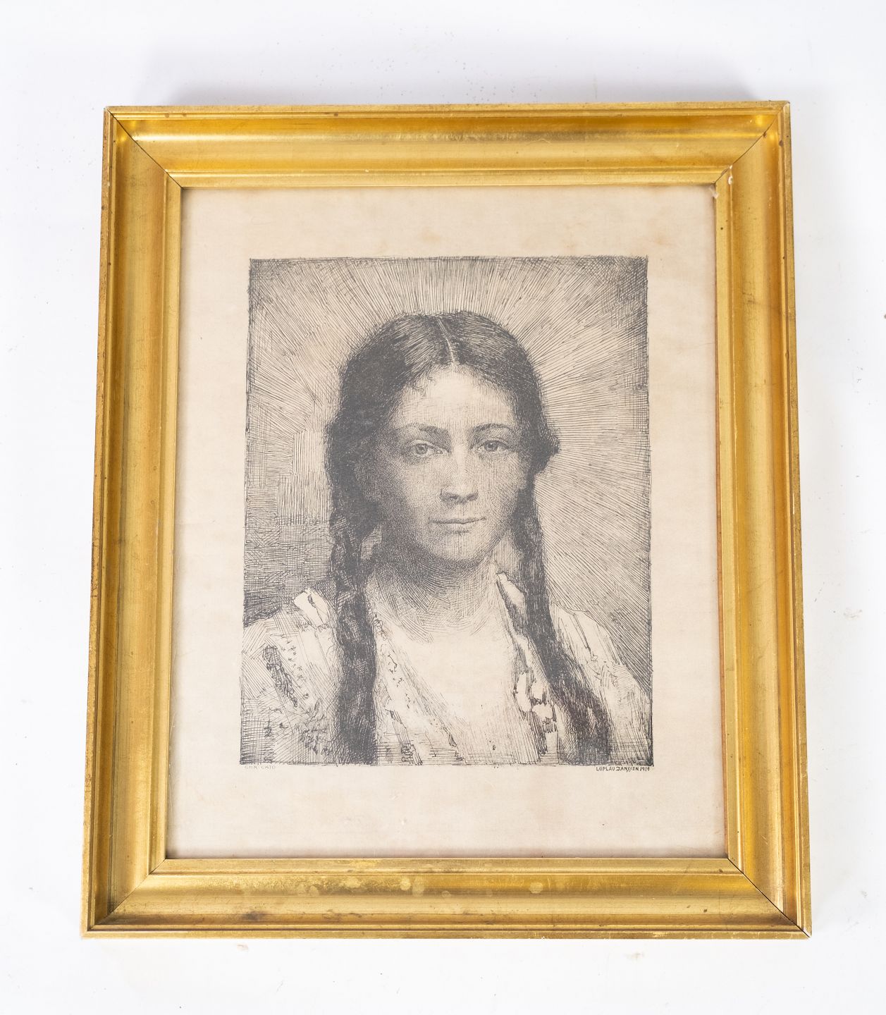 Portræt tegning med forgyldt ramme af Luplau Janssen 1869-1927.