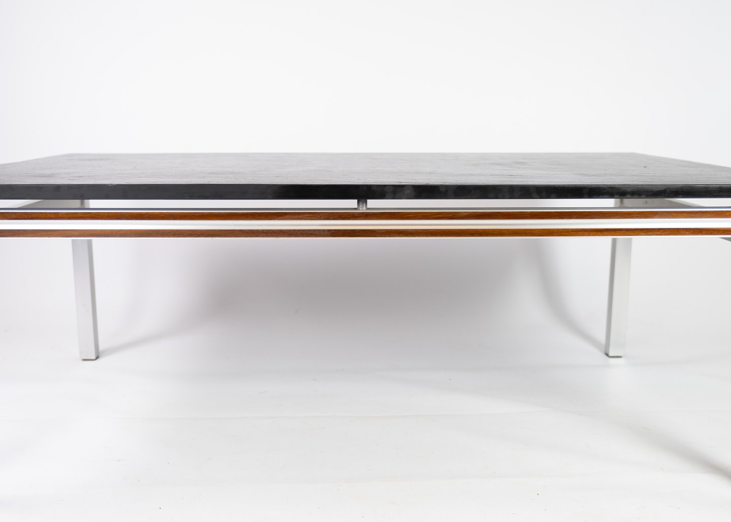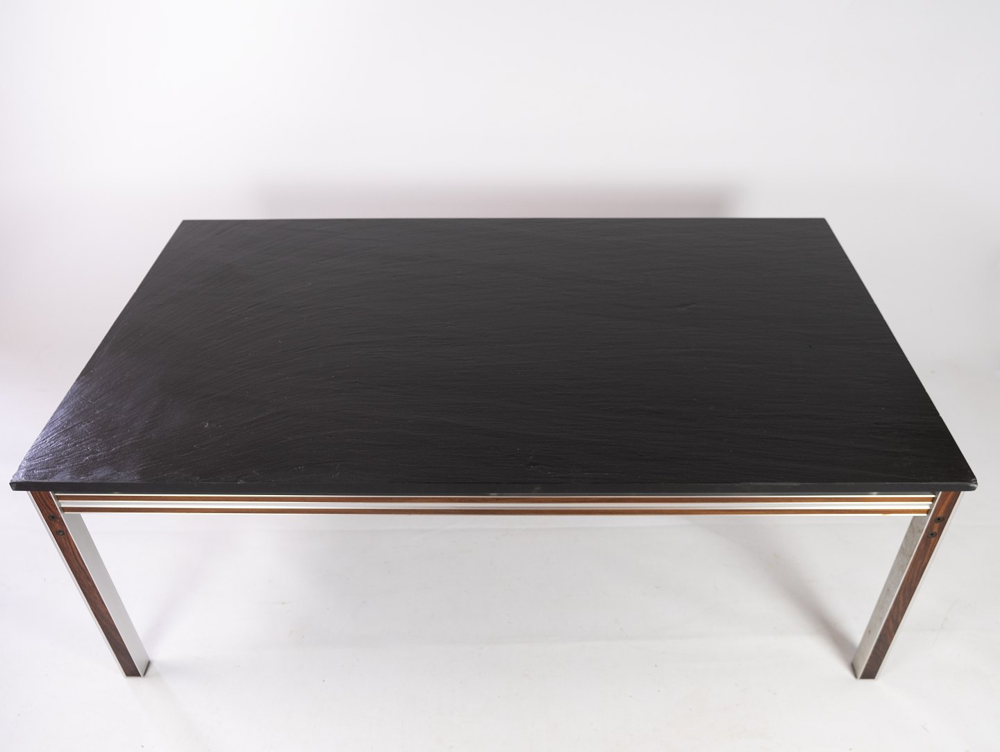 Sofabord med sort skifer plade og stel i palisander og metal, af dansk design fra 1970erne.